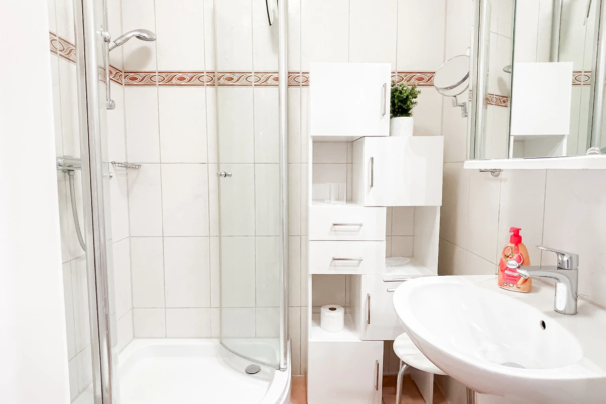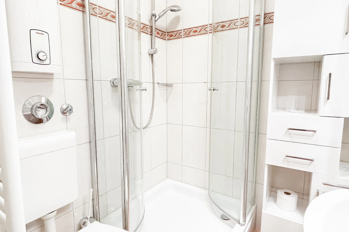 Helles Bad mit Duschkabine, WC und Waschtisch.