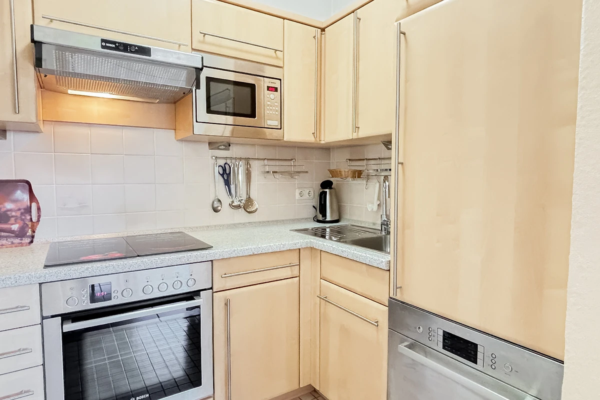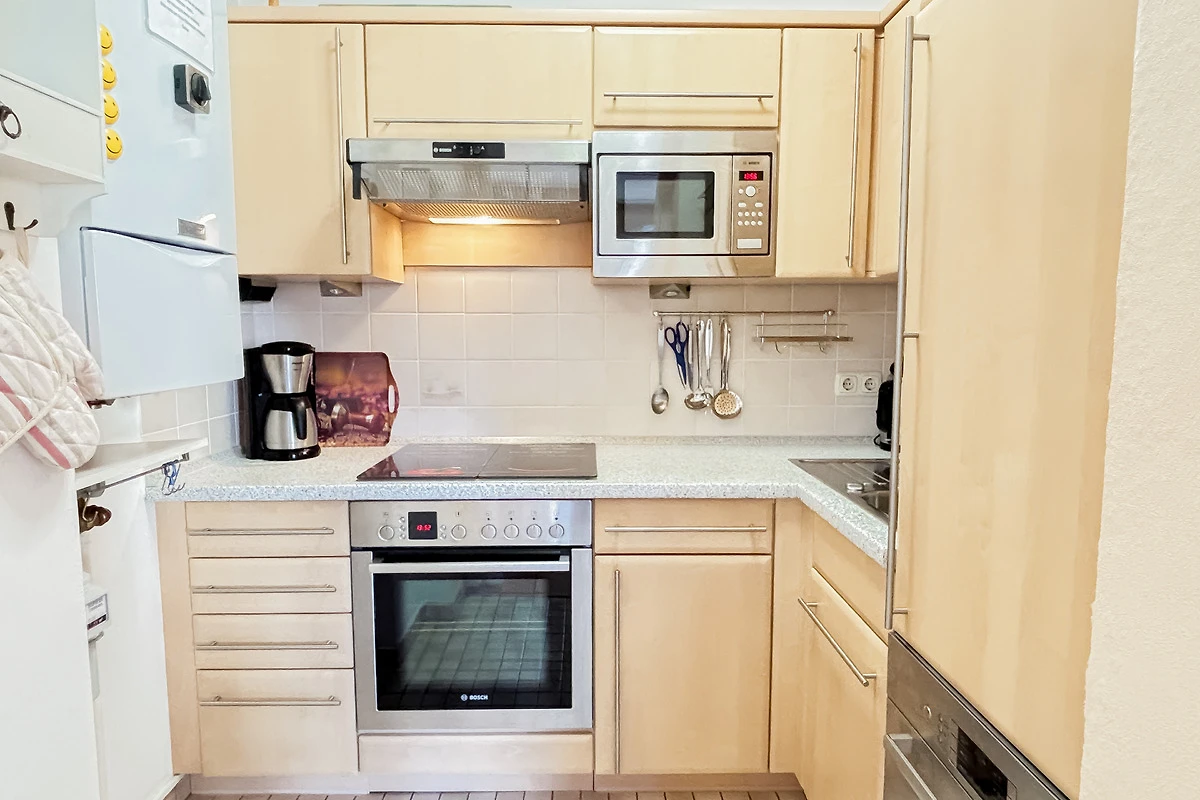 Die Küche ist mit E-Herd- Cerankochfeld + Backofen, Mikrowelle, Kühlschrank mit Gefrierfach, Geschirrspüler und den üblichen Küchengeräten sehr gut ausgestattet.