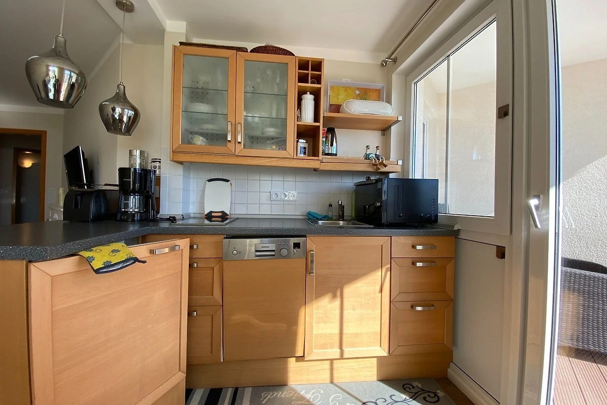 Die offene Wohnküche ist perfekt ausgestattet mit Spüle, Geschirrspüler, Kühlschrank mit Gefrierfach, 2 Platten Ceran-Kochfeld, Mikrowellen/Grill/ Backofen-Gerät und allen sonstigen üblichen Küchengeräten.