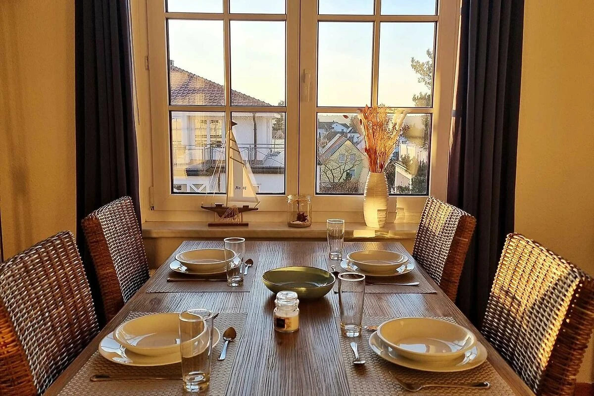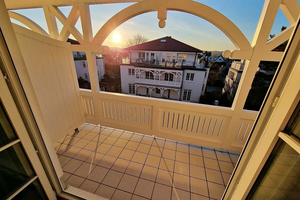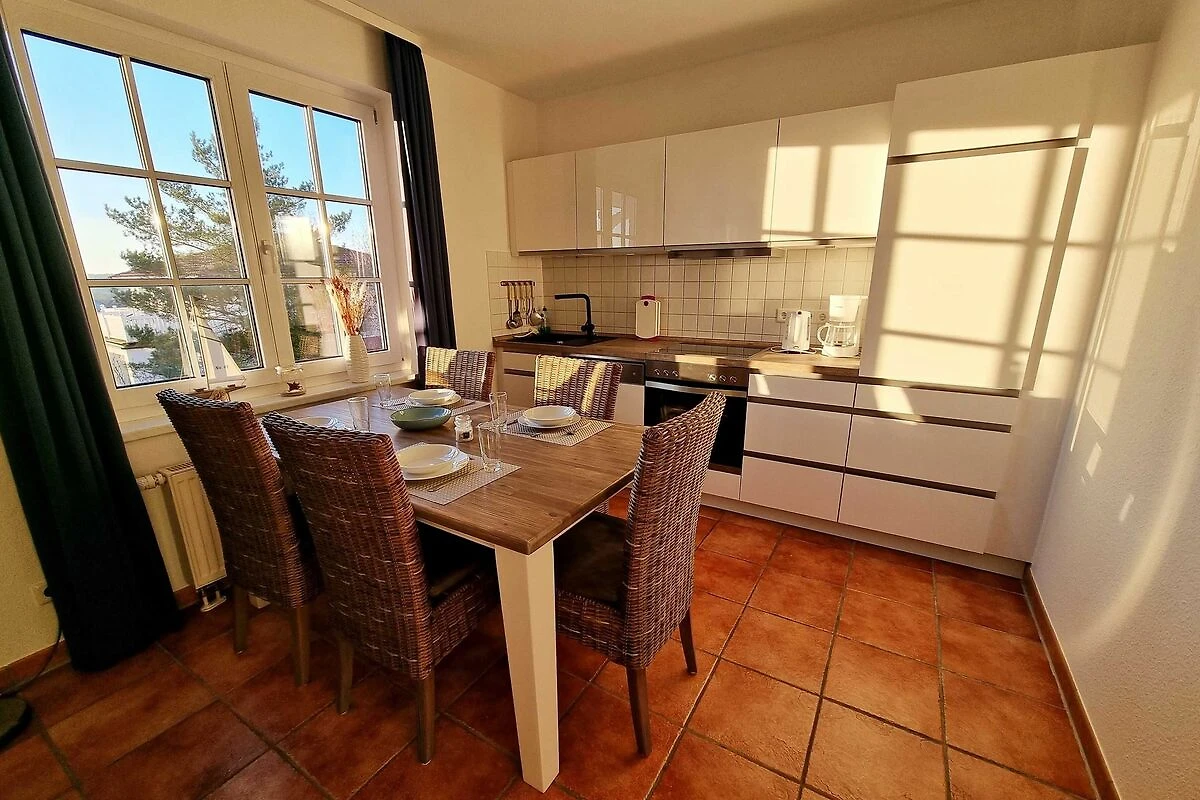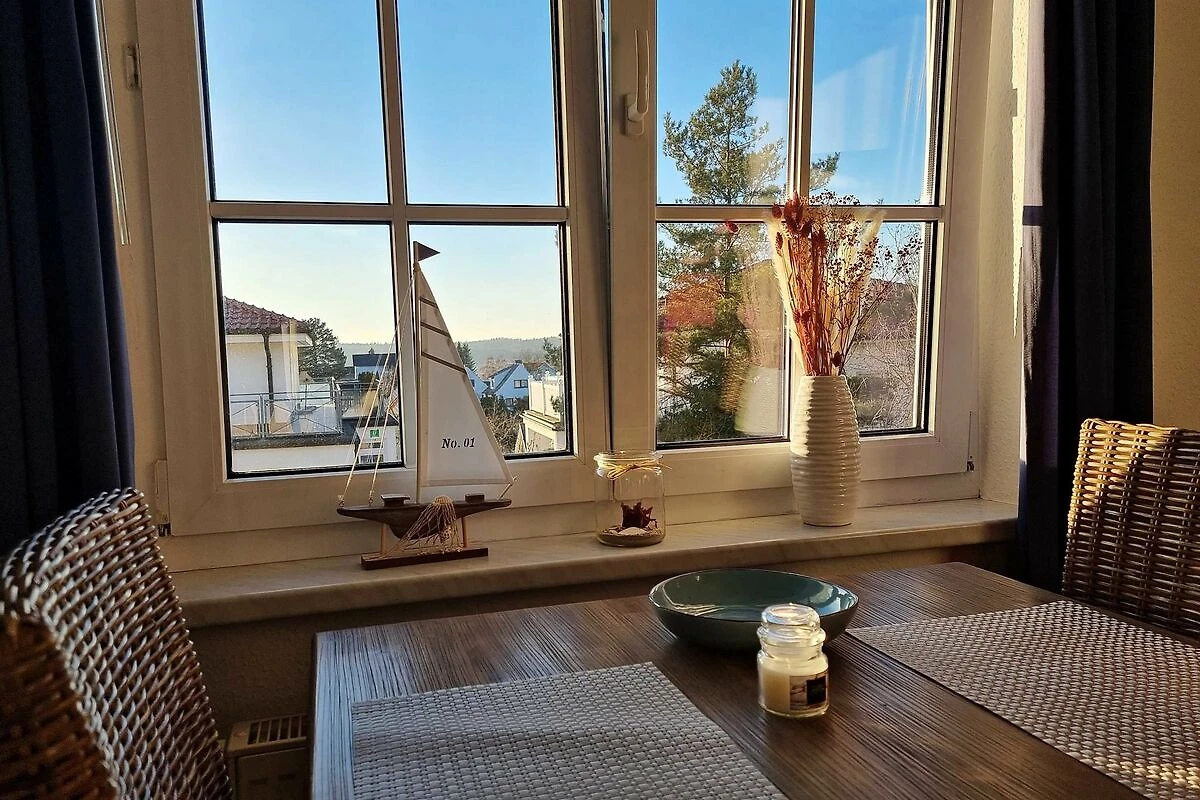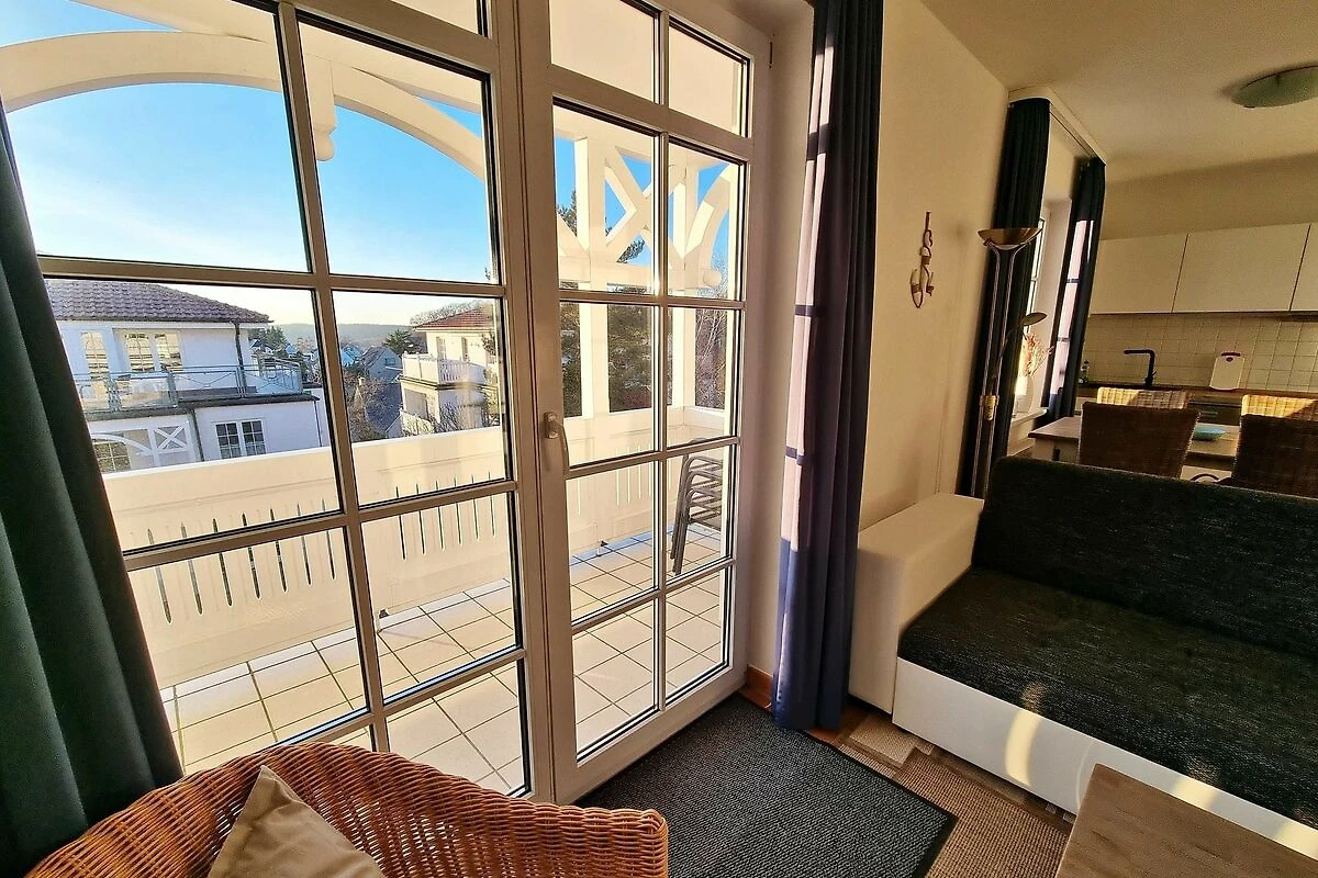 Die Villa Sanddorn ist im Ostseebad Binz, direkt am Waldrand der Granitz gelegen. Ruhig aber dennoch nur wenige Gehminuten bis zum Ortskern und zum feinsandigen Strand der Ostsee, zum Schmachter See und in den belebten Ortskern. Die Ferienwohnung 27 in der Villa Sanddorn ist ca. 48m² und für 4 Personen bestens geeignet. Vom Balkon hat man einen herrlichen Panoramablick über Binz. Das Wohnzimmer ist mit einer gemütlichen Schlafcouch, Sesseln und einem Flachbild TV, W-LAN, Radio, CD-Player, Kinderhochstuhl, eingerichtet. In der neuen, offenen Küche mit Essbereich ist alles für Ihren Urlaub vorhanden. Ein 4-Platten Cerankochfeld mit Backofen, Kühlschrank mit Gefrierfach, Spülmaschine, Filterkaffeemaschine, Toaster, Wasserkocher und reichlich Küchenutensilien sind selbstverständlich auch vorhanden. Die Wohnung bietet ein Schlafzimmer mit Doppelbett und Kleiderschrank. Im Schlafzimmer könnten Sie ein vorhandenes, kostenloses Kinderreisebett aufstellen. Das angrenzende Duschbad ist mit WC und Waschbecken ausgestattet. Auf dem Balkon kann man frühstücken oder abends den Sonnenuntergang geniessen. Desweiteren steht ein kostenloser Tiegaragenstellplatz mit einer Parkhöhe von 1,50m und kostenloses W-LAN zur Verfügung.