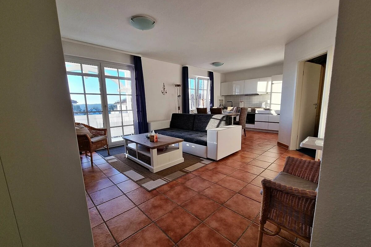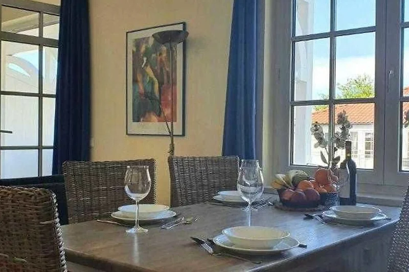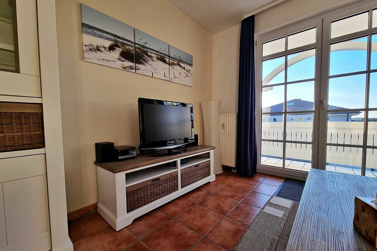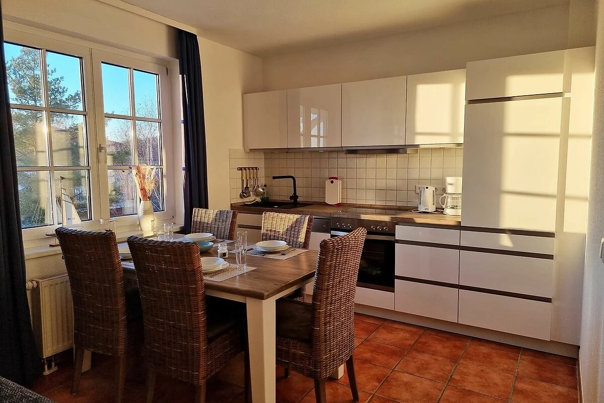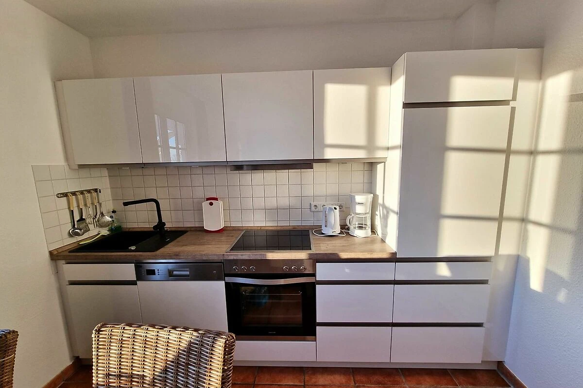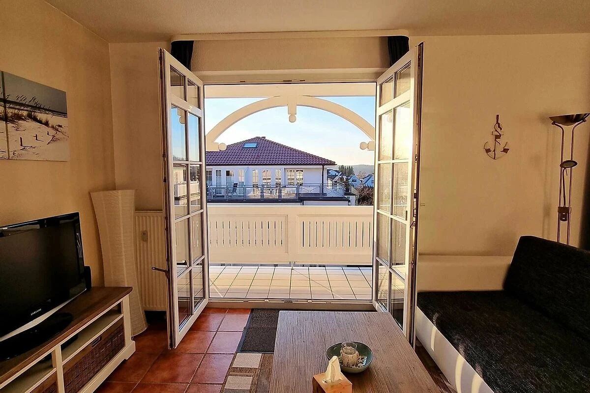 Die Villa Sanddorn ist im Ostseebad Binz, direkt am Waldrand der Granitz gelegen. Ruhig aber dennoch nur wenige Gehminuten bis zum Ortskern und zum feinsandigen Strand der Ostsee, zum Schmachter See und in den belebten Ortskern. Die Ferienwohnung 27 in der Villa Sanddorn ist ca. 48m² und für 4 Personen bestens geeignet. Vom Balkon hat man einen herrlichen Panoramablick über Binz. Das Wohnzimmer ist mit einer gemütlichen Schlafcouch, Sesseln und einem Flachbild TV, W-LAN, Radio, CD-Player, Kinderhochstuhl, eingerichtet. In der neuen, offenen Küche mit Essbereich ist alles für Ihren Urlaub vorhanden. Ein 4-Platten Cerankochfeld mit Backofen, Kühlschrank mit Gefrierfach, Spülmaschine, Filterkaffeemaschine, Toaster, Wasserkocher und reichlich Küchenutensilien sind selbstverständlich auch vorhanden. Die Wohnung bietet ein Schlafzimmer mit Doppelbett und Kleiderschrank. Im Schlafzimmer könnten Sie ein vorhandenes, kostenloses Kinderreisebett aufstellen. Das angrenzende Duschbad ist mit WC und Waschbecken ausgestattet. Auf dem Balkon kann man frühstücken oder abends den Sonnenuntergang geniessen. Desweiteren steht ein kostenloser Tiegaragenstellplatz mit einer Parkhöhe von 1,50m und kostenloses W-LAN zur Verfügung.