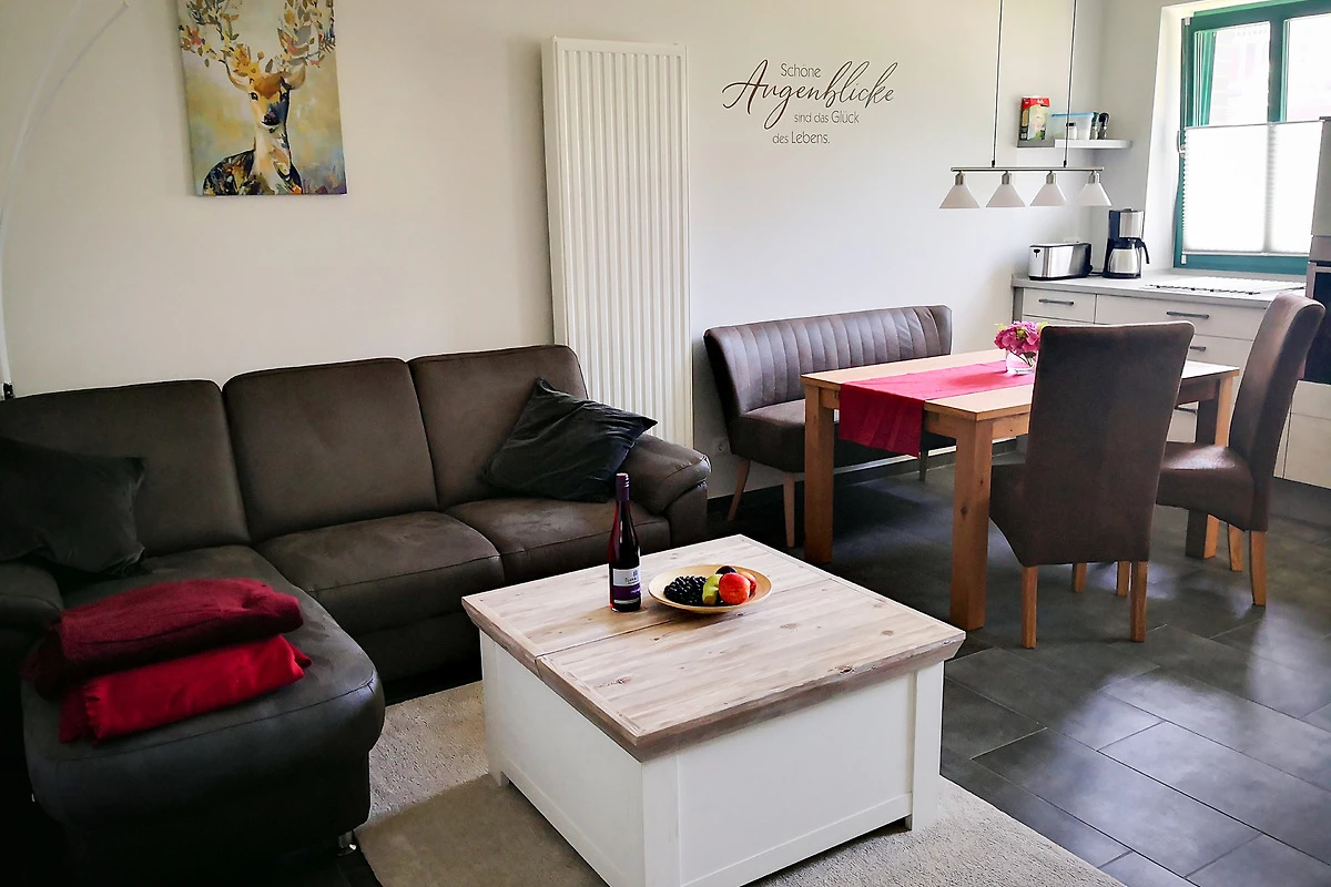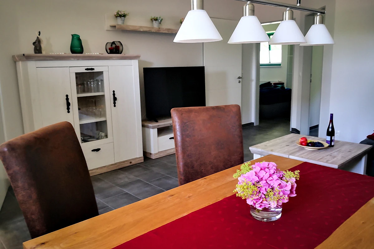 Die Ferienwohnung bietet einen grosszügigen Wohn-Essbereich mit vollausgestatteter Küche (Spülmaschanie, 4-Platten-Ceranfeld, Backofen, Mikrowelle), zwei gemütliche Schlafzimmer mit Boxspringbetten, ein Bad mit ebenerdiger Dusche und eine eigene Terrasse.