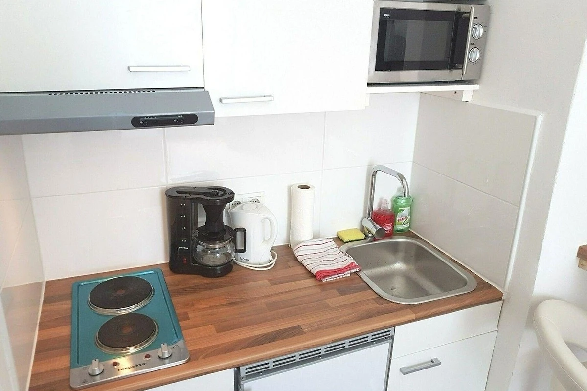 Die kleine Küche ist für einen Urlaub mit allem Notwendigen ausgestattet. Überdies gibt es in der Wohnung auch eine Waschmaschine.
