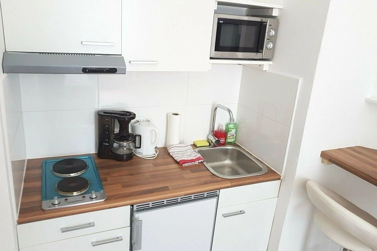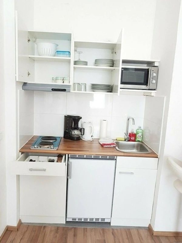 - Kleine Küche mit Kochfeld, Mikrowelle, Kühlschrank, div. Utensilien
