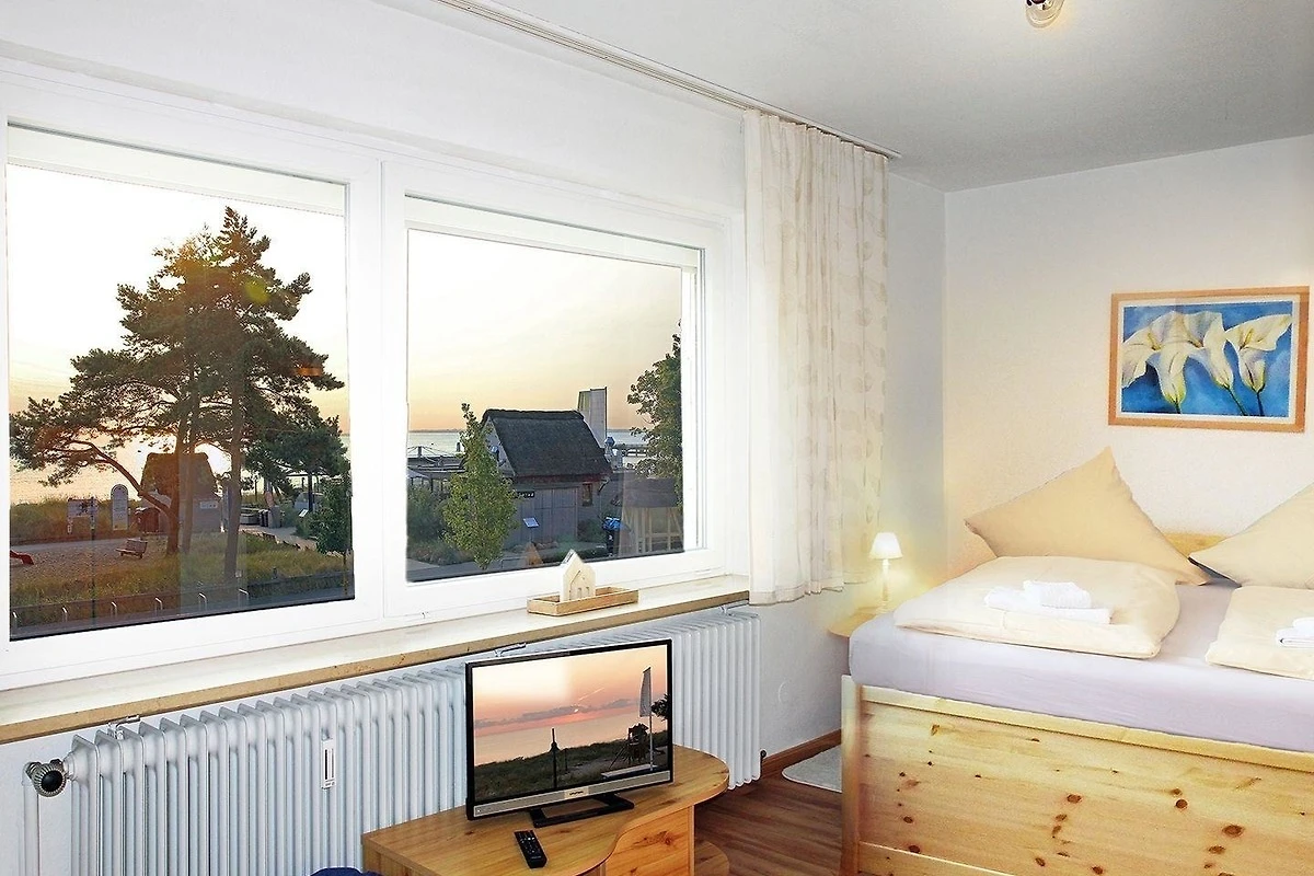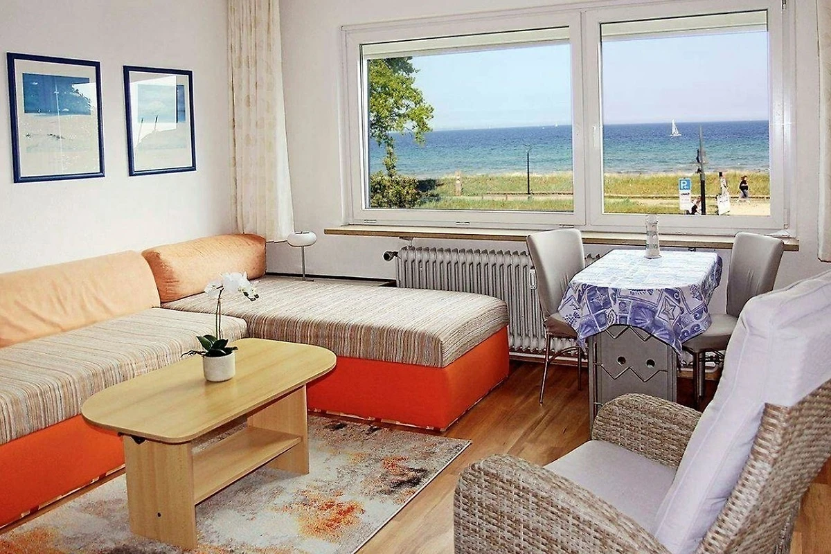 Bequem fahren Sie mit dem Fahrstuhl in die 1. Etage. In der Ferienwohnung erwartet Sie ein atemberaubender Ausblick auf das Meer. Durch die je 3 Meter grossen Panorama-Fenster im Wohn- und Schlafzimmer können Sie beobachten, wie die Ostsee sich je nach Tageszeit und Wetter immer wieder verwandelt.