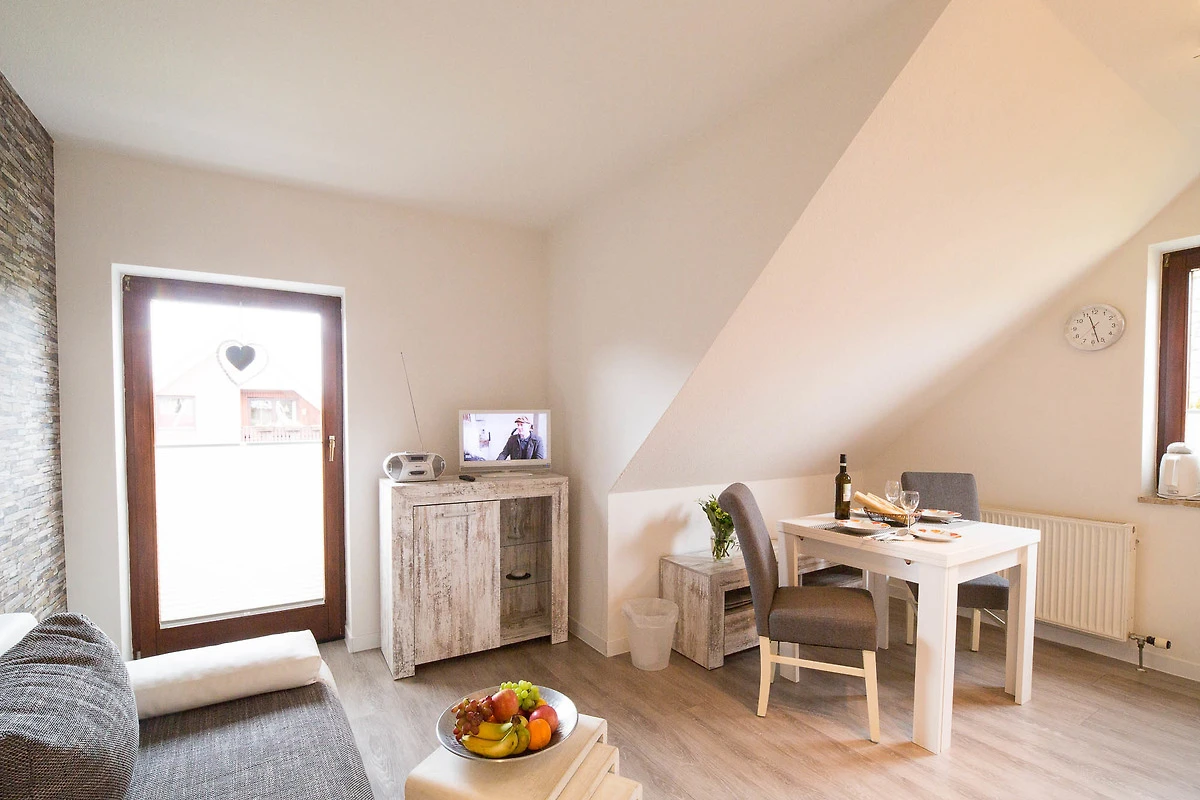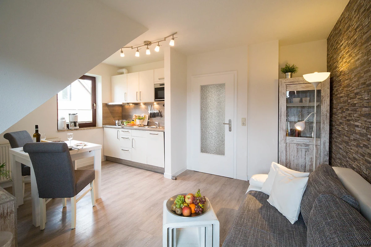 Das Wohnzimmer der Fewo ist mit Couch und Küchenzeile (mit Geschirrspülmaschine) und Essbereich ausgestattet.