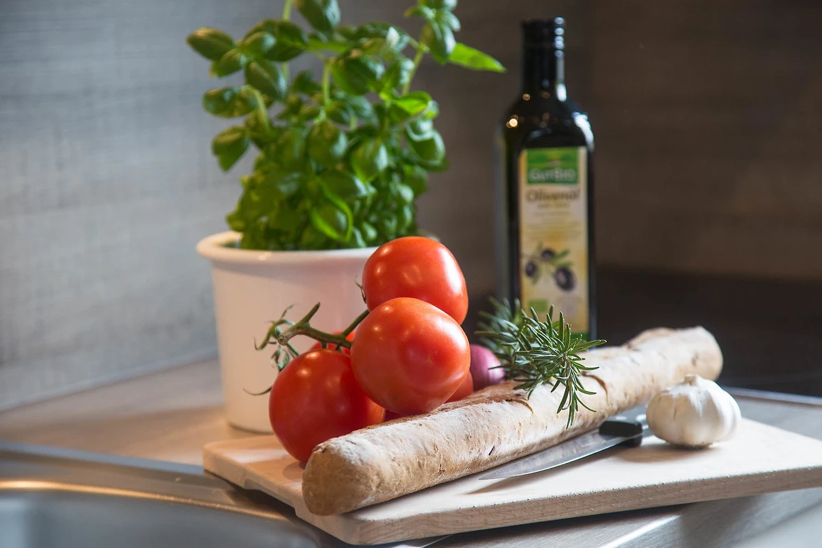 Im Wohnzimmer der Fereinwohnung befindet sich eine Couch sowie eine integrierte Küchenzeile und Essbereich.