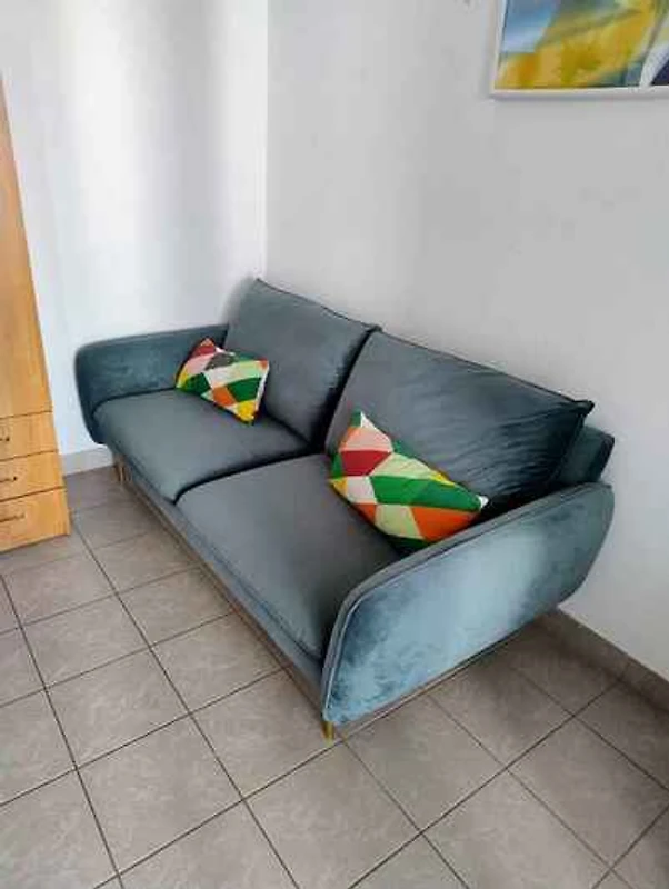 und führt über eine Aussentreppe direkt in den Flur. Wohnzimmer (8 qm) mit 1 Zusatzbett auf Couch/Sofa und Sitzecke. Schlafzimmer (10 qm) mit 1 Doppelbett, 1 Zusatzbett auf Bett (kleiner 2,00 x 0,90 m), TV und Zugang zum Balkon (8 qm). Küche (5 qm) mit Elektroherd (2 Platten), Kühlschrank (Eisfach), Mikrowelle und Kaffeemaschine. Bad (5 qm) mit Badewanne, WC und Föhn.