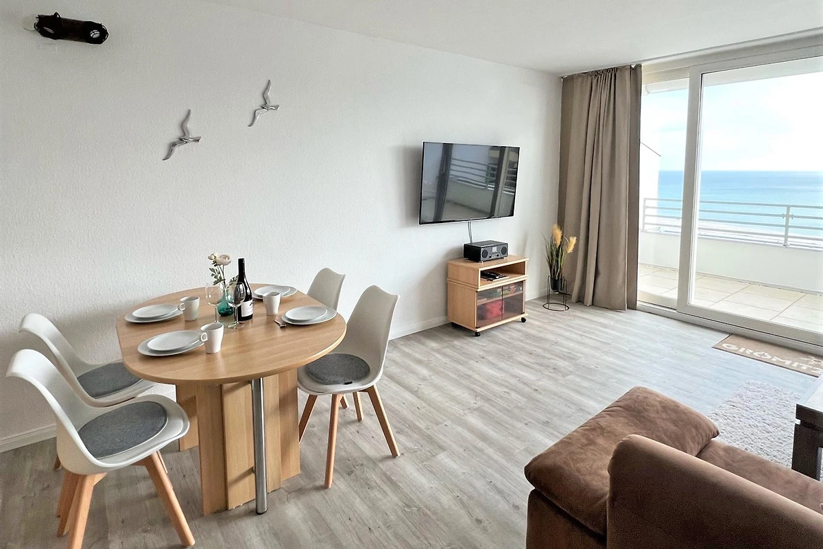 Der Wohn-/Schlafbereich verfügt über ein hochwertiges Schrankbett (140x200) und einer gemütlichen Couch mit Flachbildfernseher. Wer in dem Schrankbett schläft, kann gleich morgens beim Aufwachen den grossartigen Meerblick geniessen. Der angrenzende Essbereich ist für bis zu 4 Personen ausgerichtet und bietet Platz für gesellige Mahlzeiten.