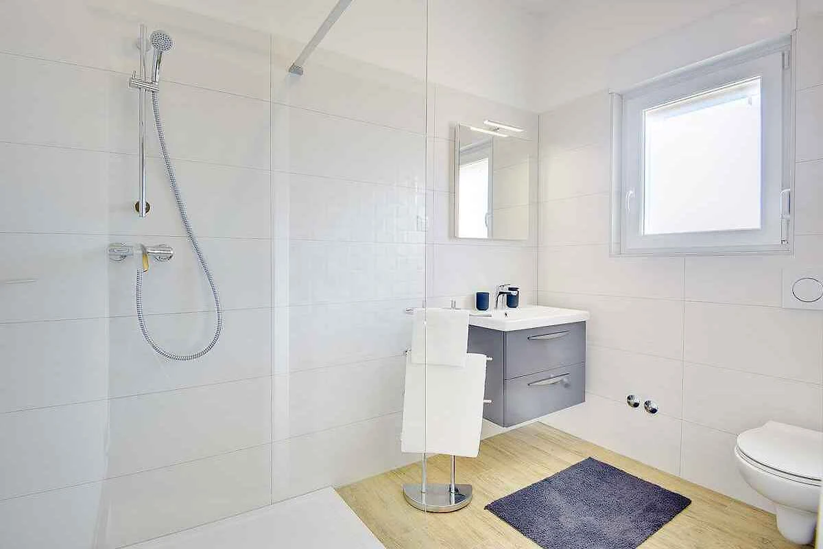 Der Eingang in Ihre Villa befindet sich im Erdgeschoss und ist überdacht. Kochecke im Wohnzimmer mit Essecke (10 Plätze), Elektroherd (Cerankochfeld, 4 Platten), Backofen, Dunstabzugshaube, Geschirrspüler, Kühlschrank (30 l, Eisfach), Mikrowelle, Kaffeemaschine, Toaster, elektrischem Wasserkocher und Zugang zur Terrasse. Wohnzimmer mit 2 Zusatzbetten auf Couch/Sofa, TV, Essecke und Zugang zur Terrasse (21 qm, überdacht, Gartenmöbel). Schlafzimmer mit 1 Doppelbett, 1 Gitterbett, Klimaanlage und Das Babybett erhalten sie auf Anfrage vor Ort. Schlafzimmer mit 2 Einzelbetten und Klimaanlage. Schlafzimmer mit 2 Einzelbetten, TV und Klimaanlage. Schlafzimmer mit 1 Doppelbett, TV und Klimaanlage. Bad mit Dusche, 1 Waschbecken, WC und Föhn. 3 Bäder jeweils mit Dusche, 1 Waschbecken und WC. Separates WC mit 1 Waschbecken und WC.