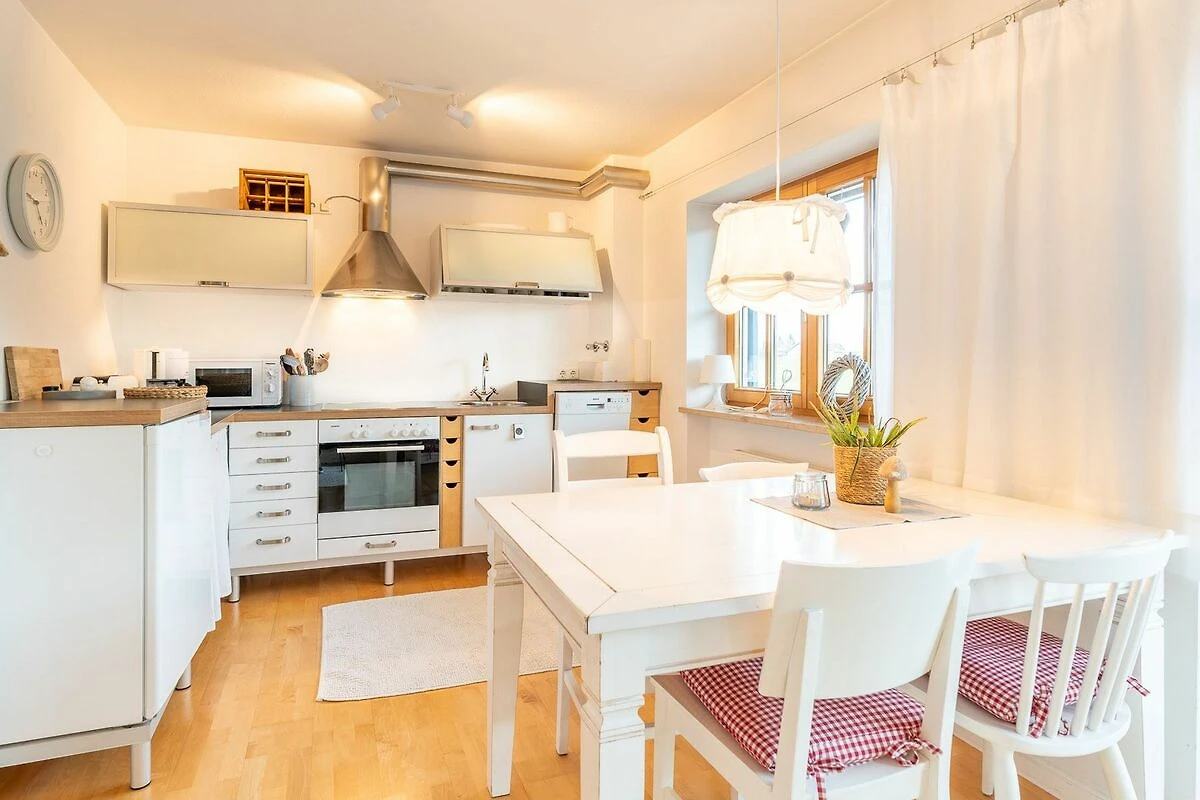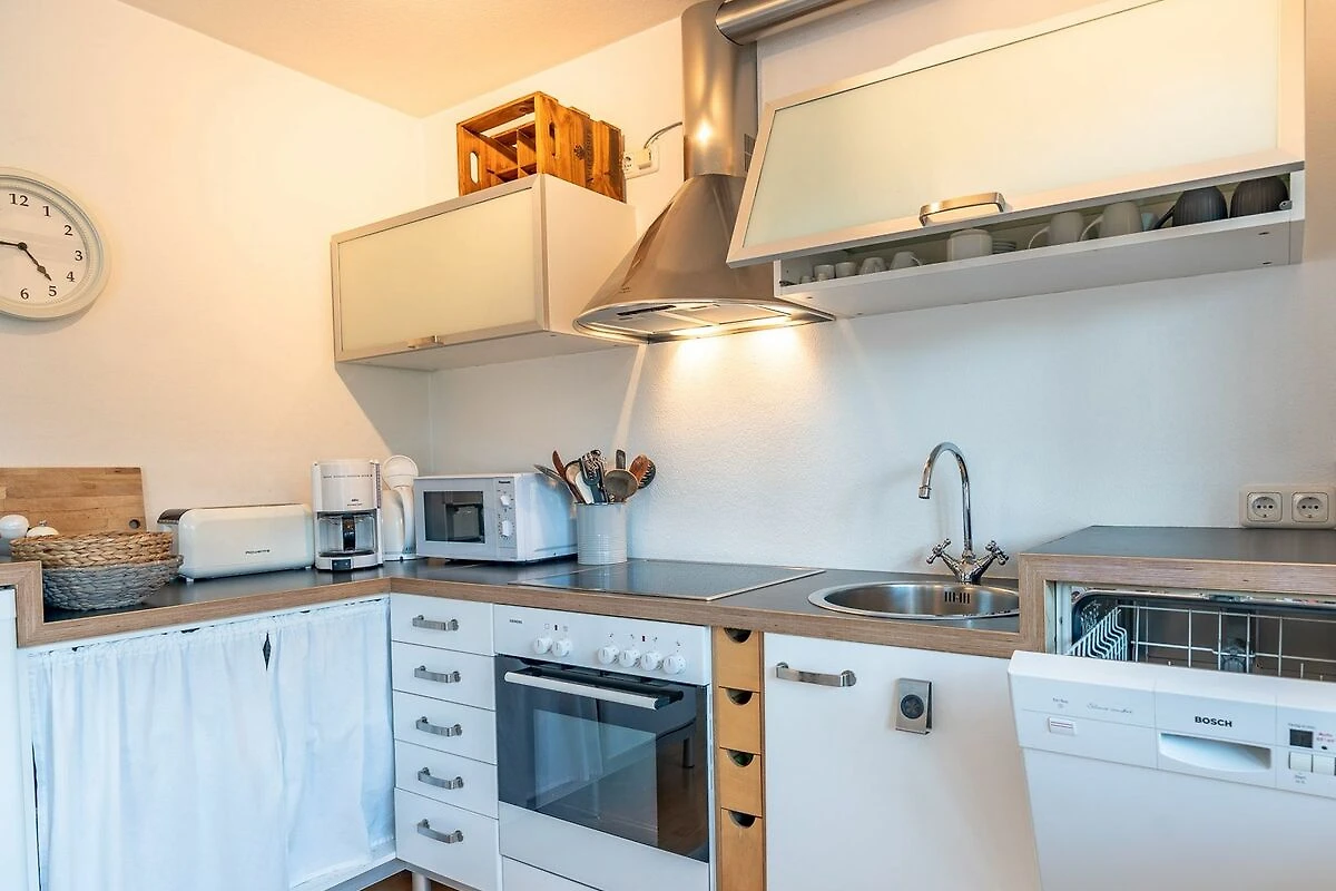 Die Wohnung verfügt über einen hellen Wohnraum mit Essbereich von dem Sie einen direkten Zugang auf die Terrasse mit Bergsicht haben. Die gut ausgestattete Küche lässt das Herz von Selbstversorgern höher schlagen. So gibt es neben Pfanne, Topf, Geschirr und Besteck auch ein Ceran-Kochfeld mit Dunstabzugshaube, Backofen und Geschirrspülmaschine.