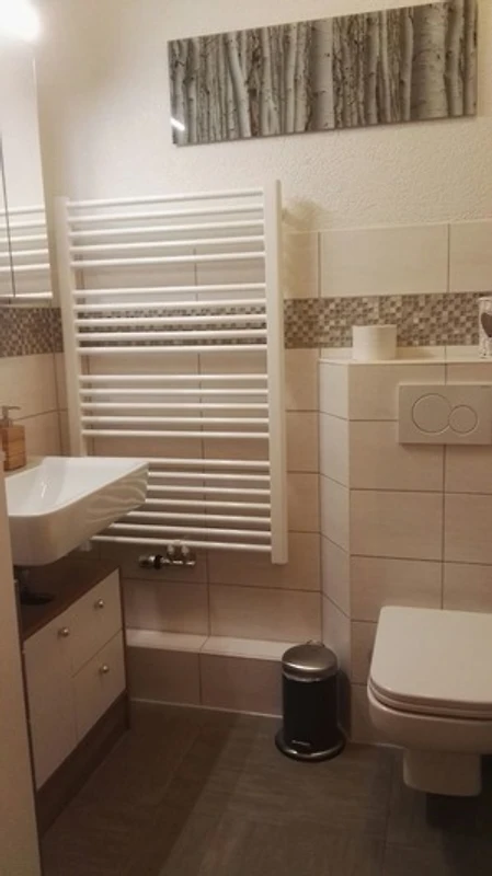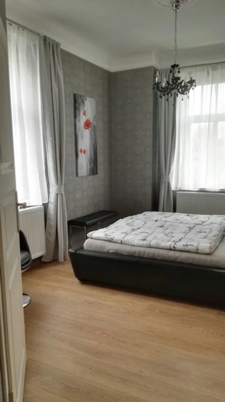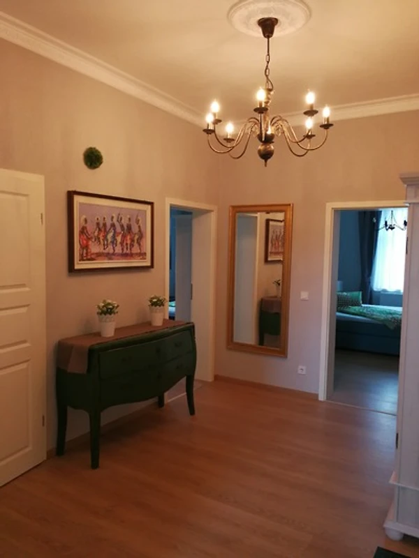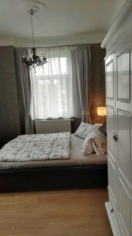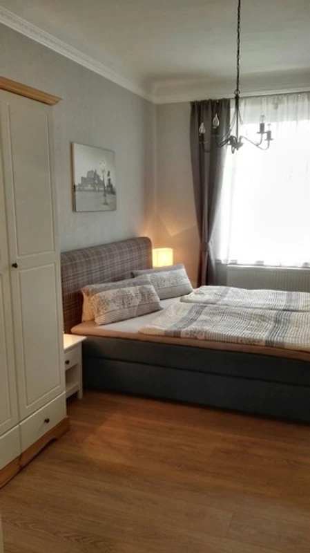 Die Ferienwohnung befindet im ersten Obergeschoss eines sanierten Gründerzeithauses von 1899. Sie besteht aus zwei Schlafzimmern, zwei Bädern und einem Wohnzimmer mit grossem Esstisch, Couch, Sessel und SAT-TV. Auf dem abgeschlossenen Grundstück können Sie Ihr Auto sicher abstellen. Zur Ferienwohnung gehört ein kleiner Sitzbereich im Hof/Garten.