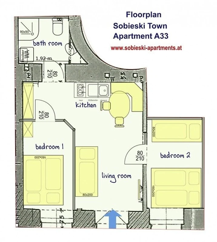 2 Schlafzimmer + 1 zentrales Wohnzimmer mit Küche + 1 Badezimmer bieten angenehme Unterkunft für Gruppen und Familien. Eine zusätzliche Schlafmöglichkeit ist bei Bedarf im Wohnzimmer auf einer soliden Schlafcouch gegeben. Alle Zimmer sind schön hell, getrennt begehbar und die hohe Raumhöhe bietet ein angenehmes Raumgefühl.