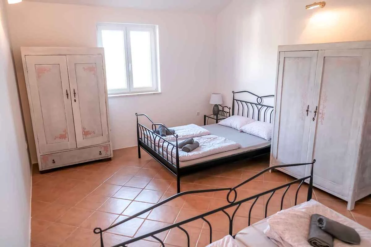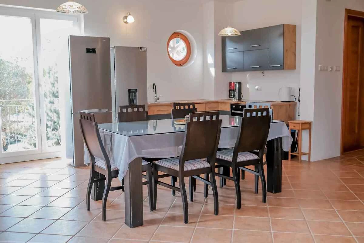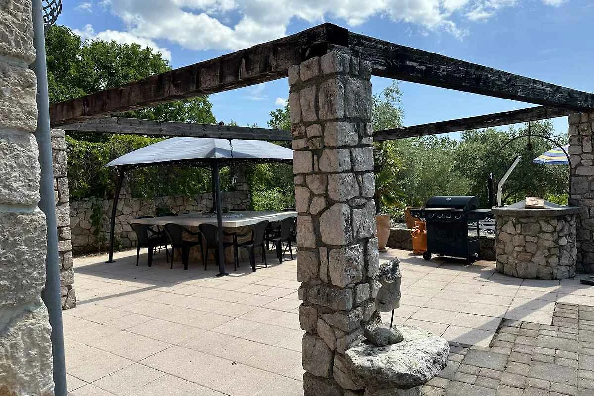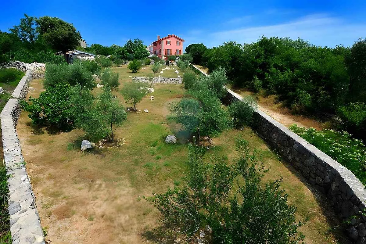 Vrbnik, Ortsteil Garica. Die Villa befindet sich auf einem 3000 qm grossen, geschlossenen Gartengrundstück mit Wiese, Blumen, Sträuchern und Bäumen, von einem Zaun und einer Hecke begrenzt. Der Vermieter wohnt nicht im Haus oder auf dem Grundstück. Die Zufahrt erfolgt über einen Weg (asphaltiert). Parkplatz auf dem Grundstück.
