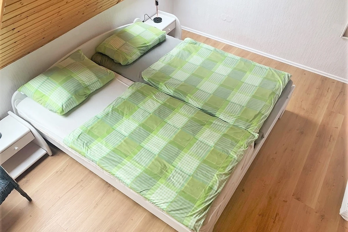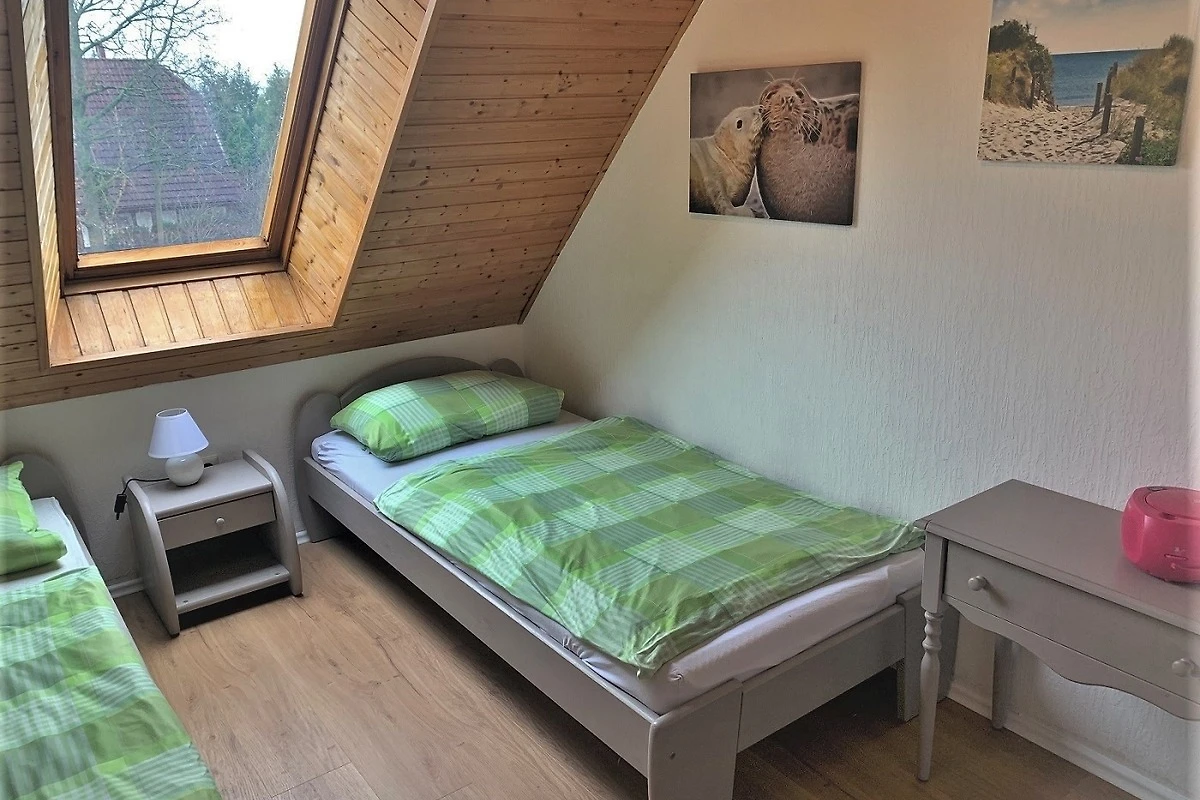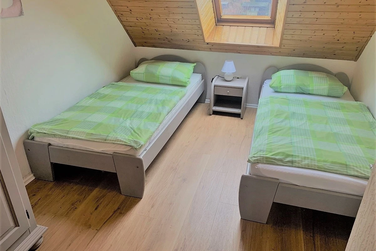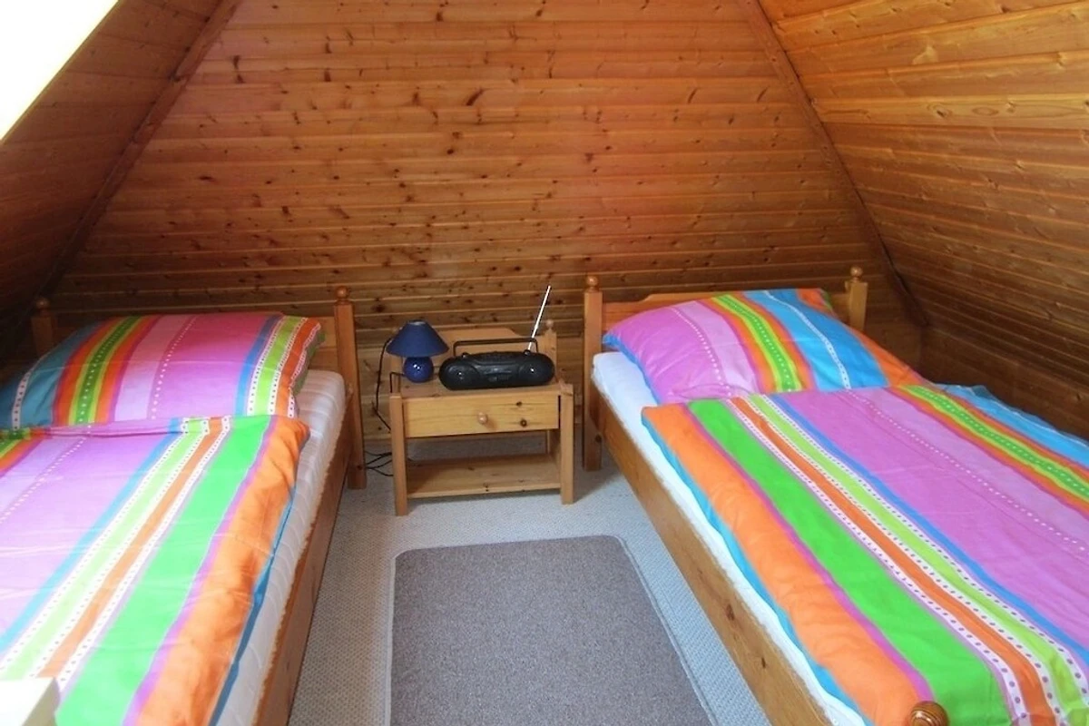 Vom Wohnzimmer gelangen Sie zur Terrasse und in den Garten. Es sind Gartenmöbel für sechs Personen vorhanden. Im Obergeschoss befinden sich zwei gemütliche Schlafzimmer. Von einem der Schlafzimmer führt eine offene Holztreppe zu einem dritten Schlafzimmer mit zwei weiteren Betten .Dort befindet sich der Zweitfernseher. Das Ferienhaus ist ausgelegt für 5 Personen.