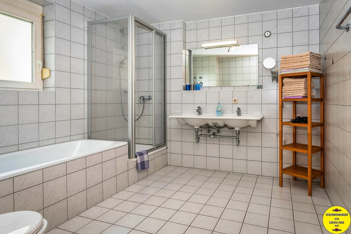 Das Tageslicht-Badezimmer verfügt über eine Badewanne und eine separate Dusche sowie über ein Doppelwaschbecken.