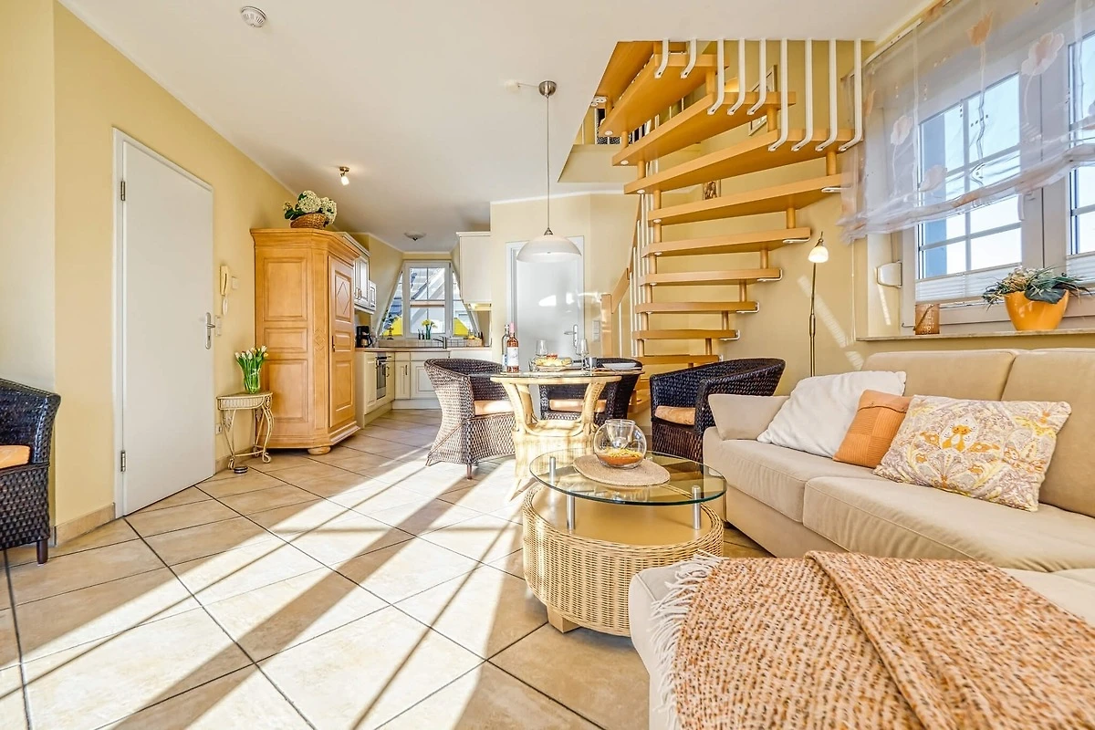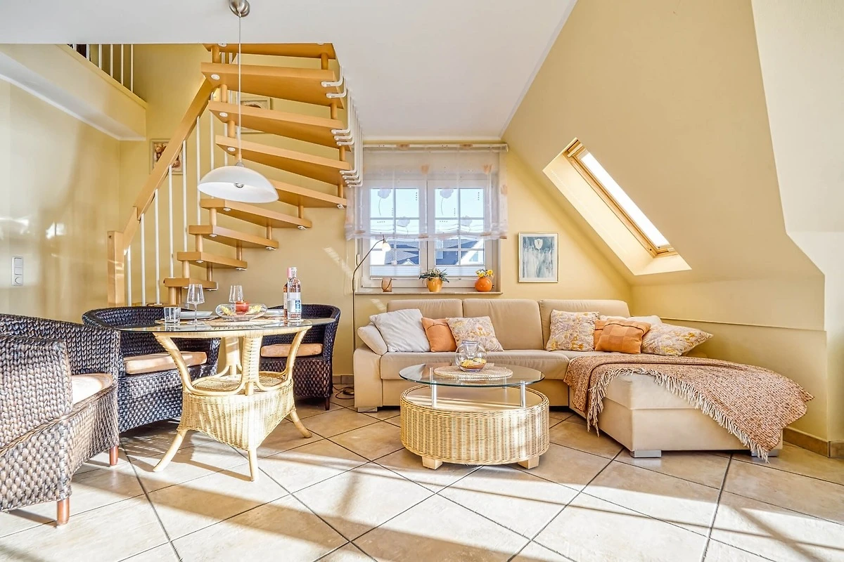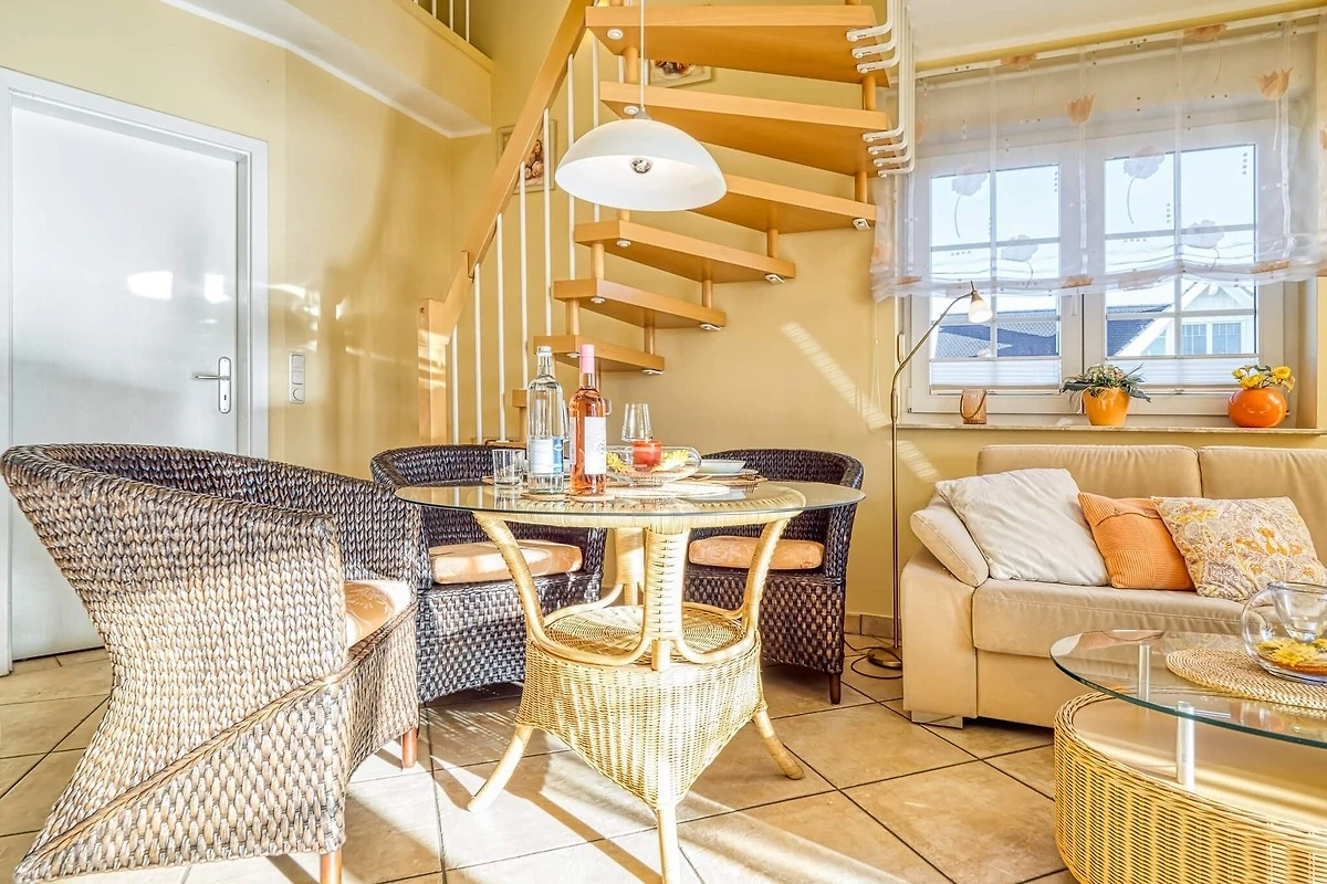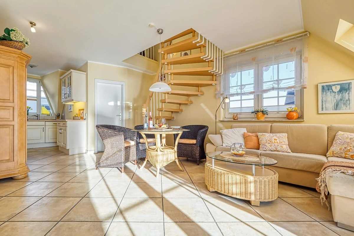 Über den separaten Eingang zu einem Treppenhaus betreten Sie im ersten Stock links die Ferienwohnung mit gemütlicher Sitzecke und Zugang zum Balkon. Bei mehr als zwei Gästen lässt sich die Couch zu einem Bett umfunktionieren. Der Wohnbereich umfasst auch den Essbereich und eine Küchenzeile mit Geschirrspüler, Kühlschrank mit Gefrierkombination und Backofen.