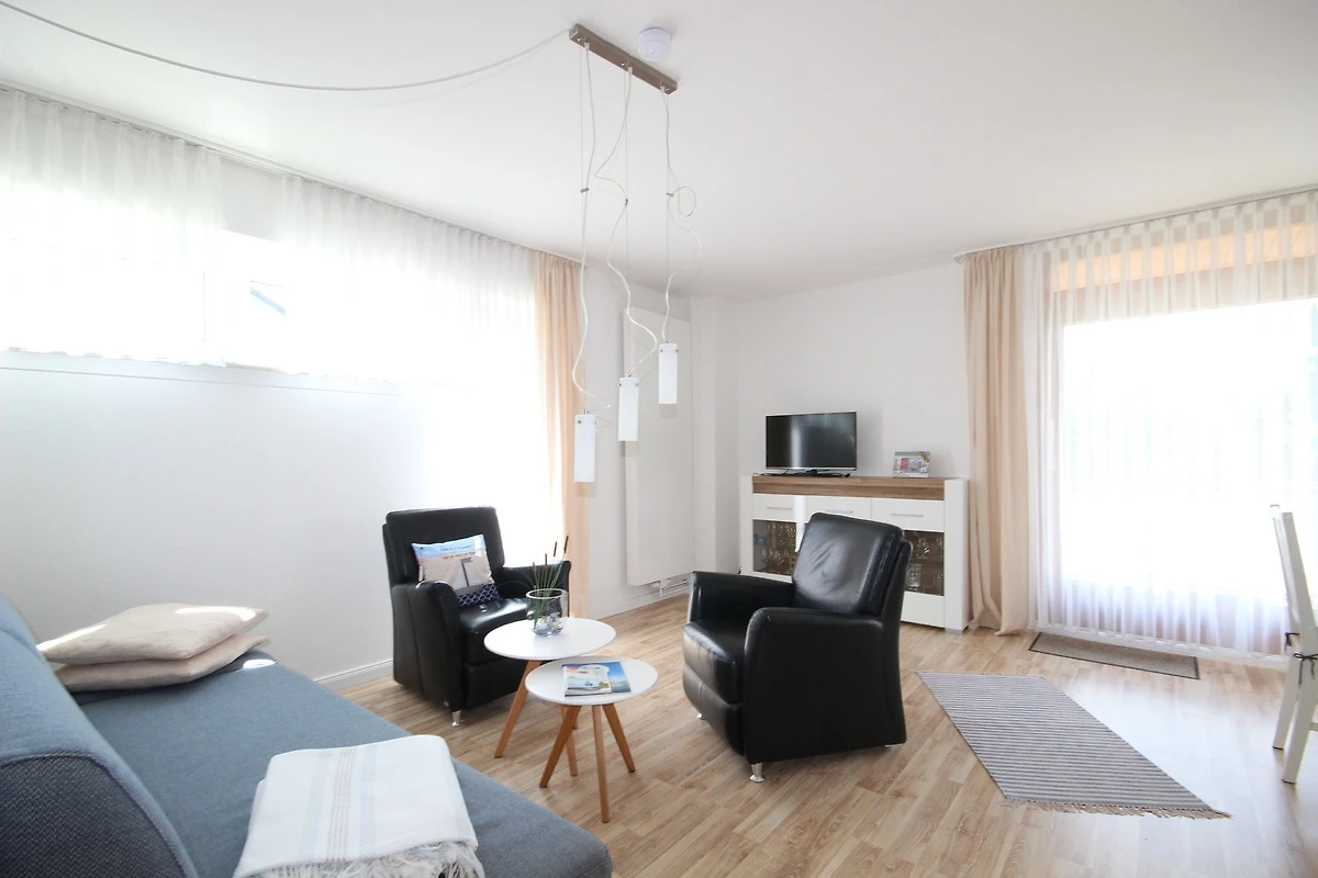Das gemütliche Wohnzimmer ist ausgestattet mit einem schönen Schlafsofa, Essplatz für 4 Personen, TV, Radio und hat Zugang zum möblierten, sonnigen Süd-Balkon.
