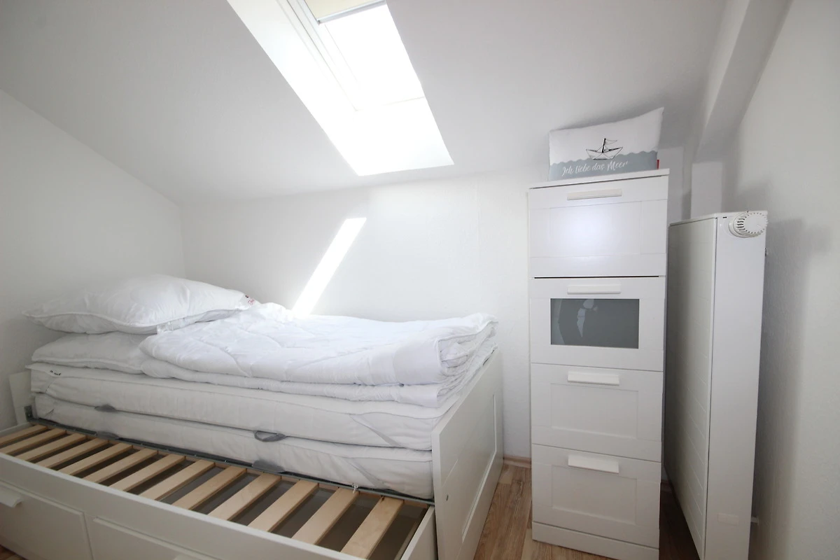 Das 2. Schlafzimmer verfügt über ein ausziehbares Bett & eine kleine Kommode.