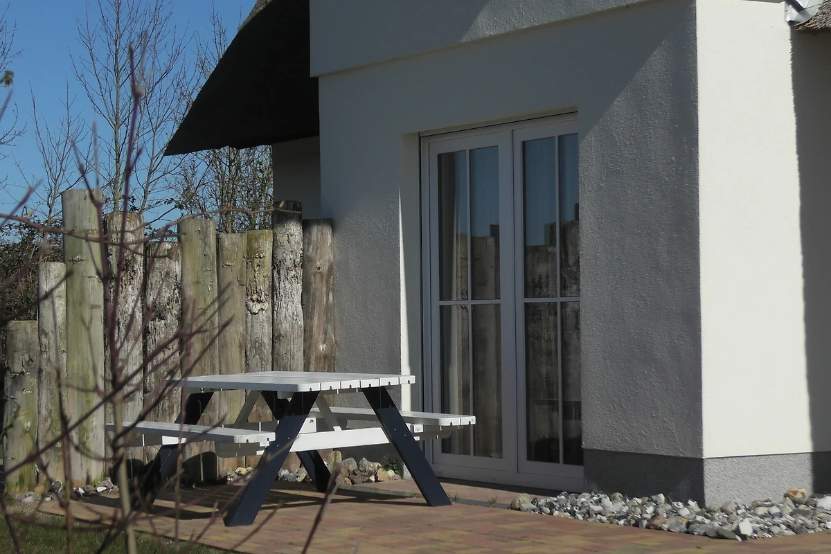 Eine Picknickbank für das gemeinsame Frühstück auf der Südterrasse und weitere Gartenmöbel mit einem grossem Tisch auf der Westterrasse stehen zu Verfügung.