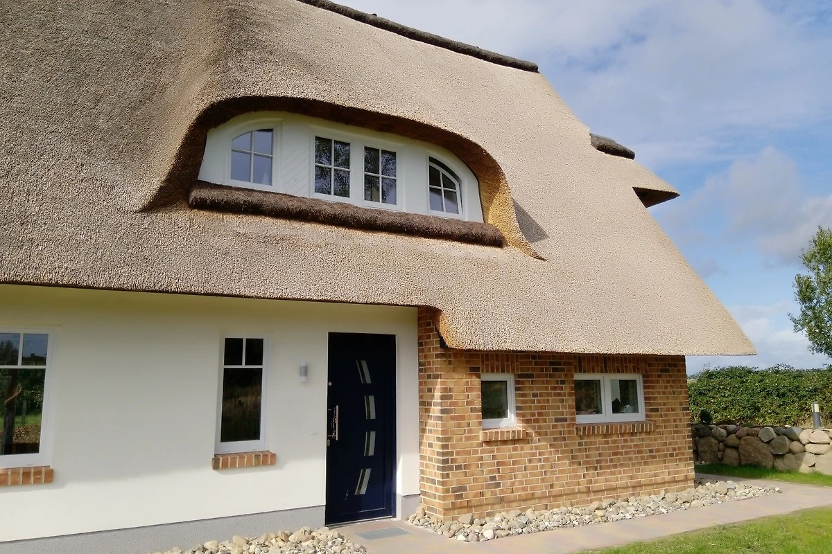 Grosszügiges familienfreundliches Reetdach-Ferienhaus in Strandnähe mit 5 Schlafzimmern, 3 Bädern, Sauna, Gäste-WC und 3 Terrassen.