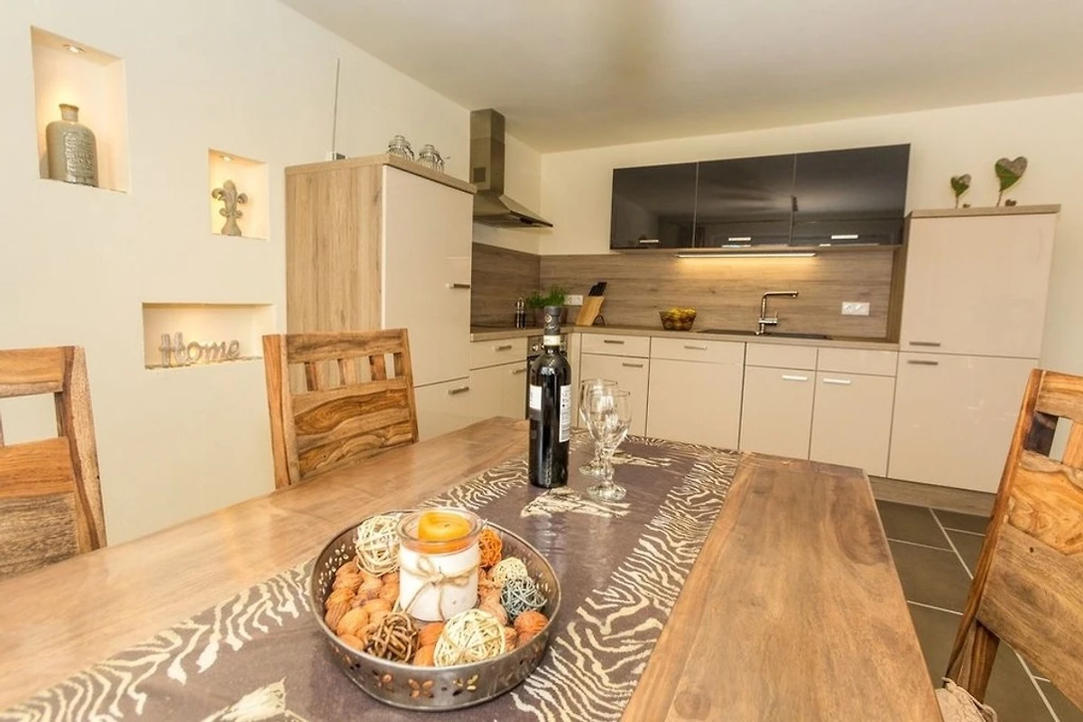 1 hochwertige neue Einbauküche mit grosszügiger Ausstattung inkl. Spülmaschine und wunderschöner Essgruppe aus massiven Kolonialmöbeln .