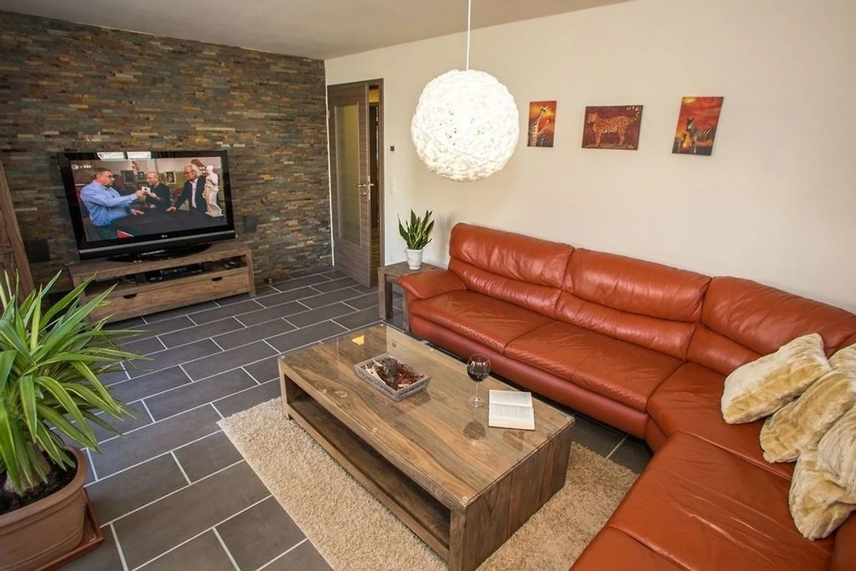 1 Wohnzimmer mit Echt-Ledercouch, 50-Zoll-LED, Hintergrundbeleuchtungen, Doppel-Terrassentür zur grossen eigenen Terrasse mit 2 Liegestühlen und Grillplatz
