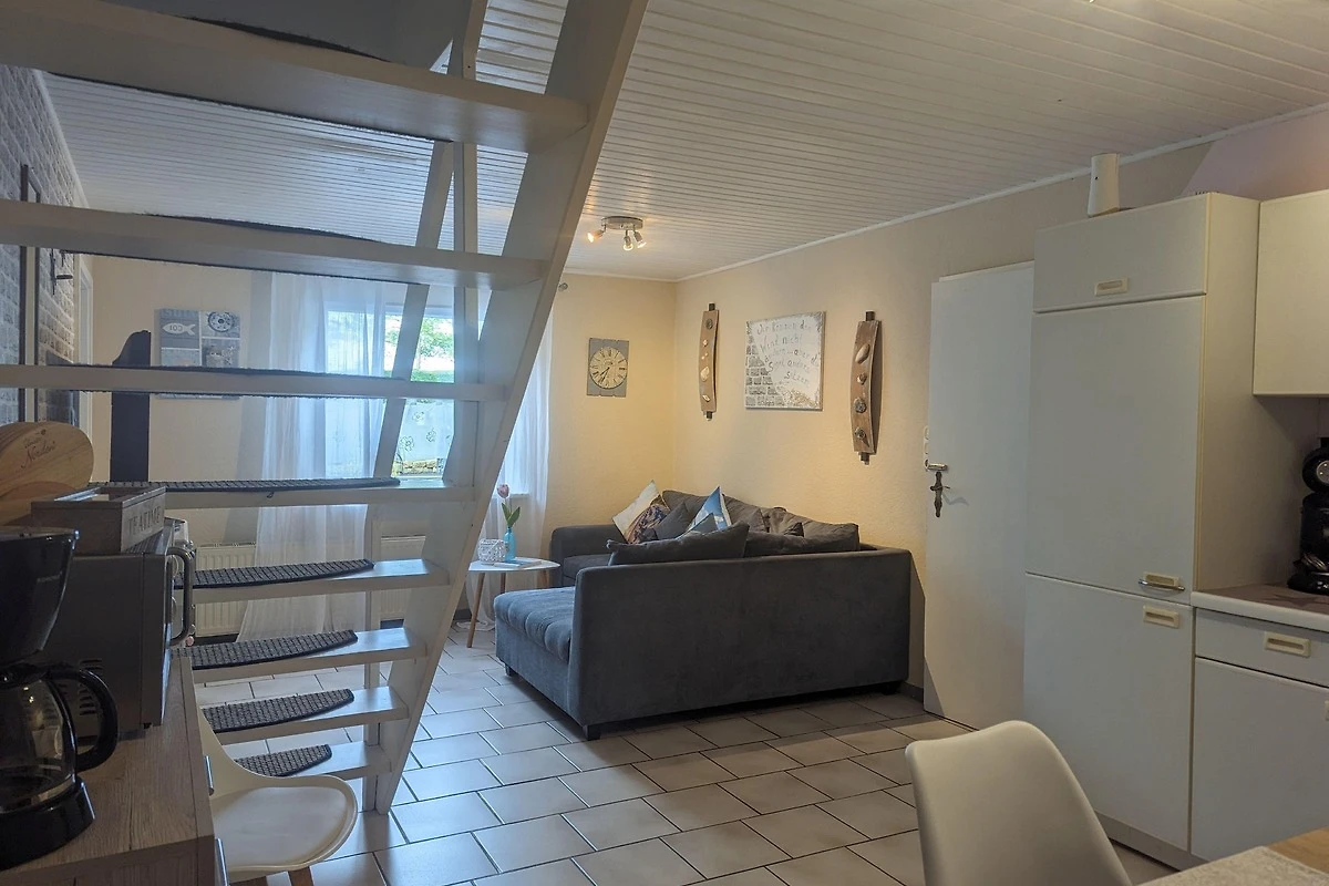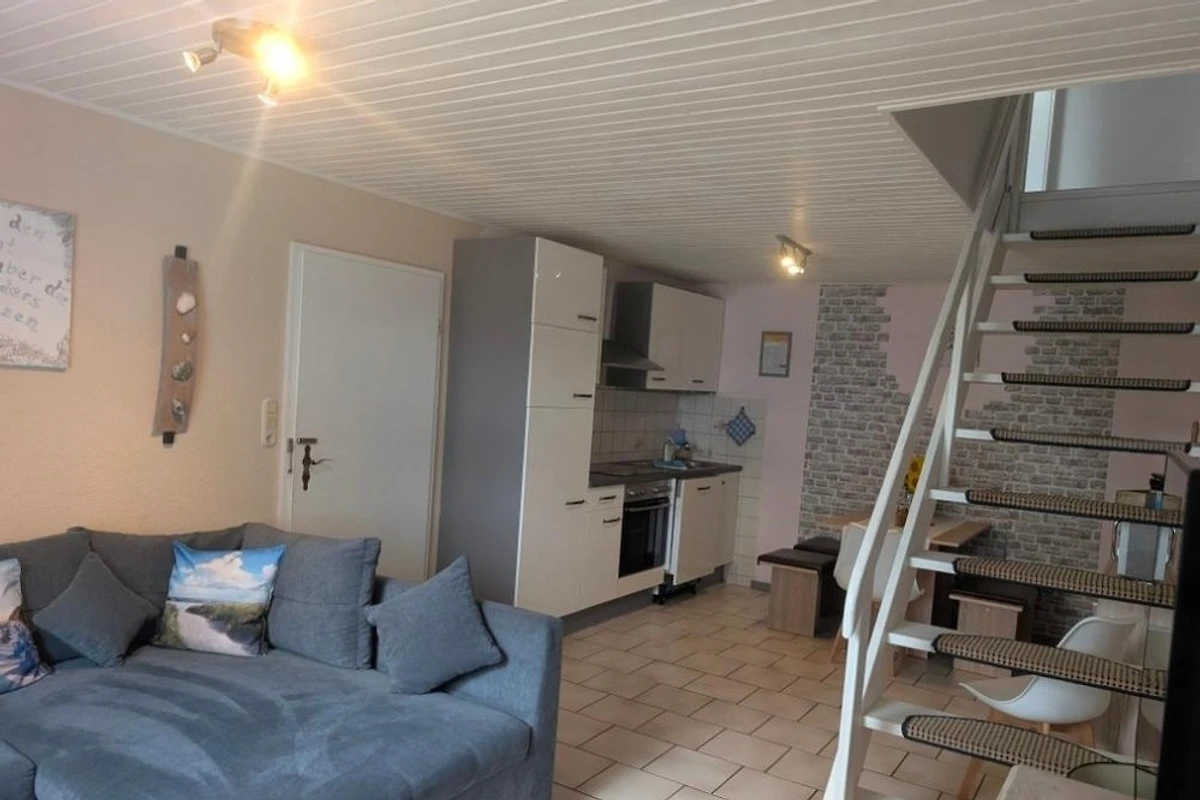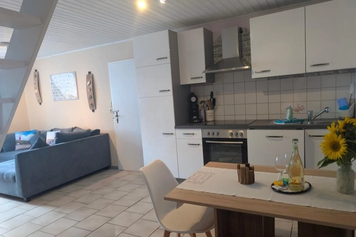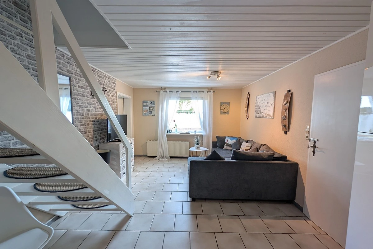 Neben dem Wohnraum, der den Mittelpunkt der Ferienwohnung ausmacht (75 qm), ausgestattet mit bequemer Sofaecke sowie integrierter Einbauküchenzeile, befindet sich das grosse Duschbad und das grössere Schlafzimmer mit Doppelbett (1,80 x 2 m). Alles grosszügig und schön ebenerdig. Es führt eine dekorative Holztreppe ins Obergeschoss zu 2 gemütlichen Schlafräumen, 2. Schlafraum mit einem Doppelbett (1,80 x 2 m) 3. Schlafraum mit 2 Einzelbetten ( 0,90 x 2 m ) unter dem Dach. Handtücher/Bettwäsche inklusive. Vor der geräumigen Ferienwohnung befindet sich eine Terrasse mit Gartenmöbel.