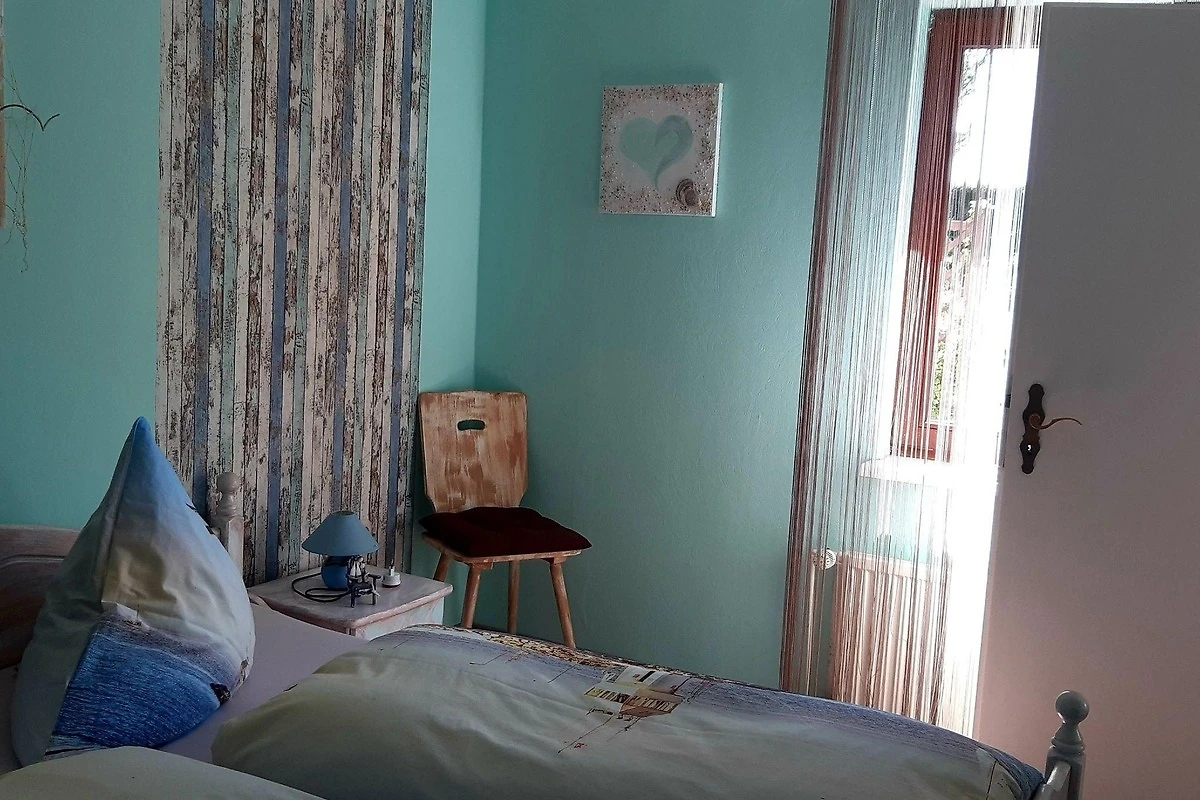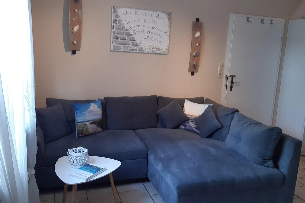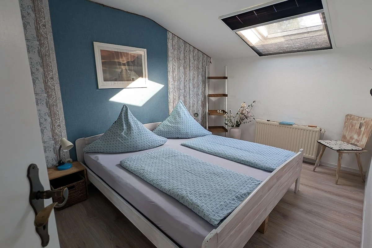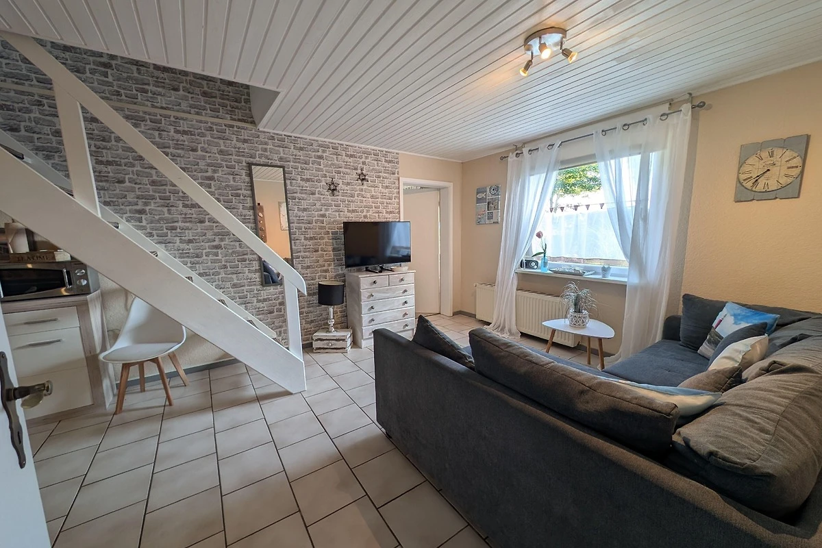 Neben dem Wohnraum, der den Mittelpunkt der Ferienwohnung ausmacht (75 qm), ausgestattet mit bequemer Sofaecke sowie integrierter Einbauküchenzeile, befindet sich das grosse Duschbad und das grössere Schlafzimmer mit Doppelbett (1,80 x 2 m). Alles grosszügig und schön ebenerdig. Es führt eine dekorative Holztreppe ins Obergeschoss zu 2 gemütlichen Schlafräumen, 2. Schlafraum mit einem Doppelbett (1,80 x 2 m) 3. Schlafraum mit 2 Einzelbetten ( 0,90 x 2 m ) unter dem Dach. Handtücher/Bettwäsche inklusive. Vor der geräumigen Ferienwohnung befindet sich eine Terrasse mit Gartenmöbel.