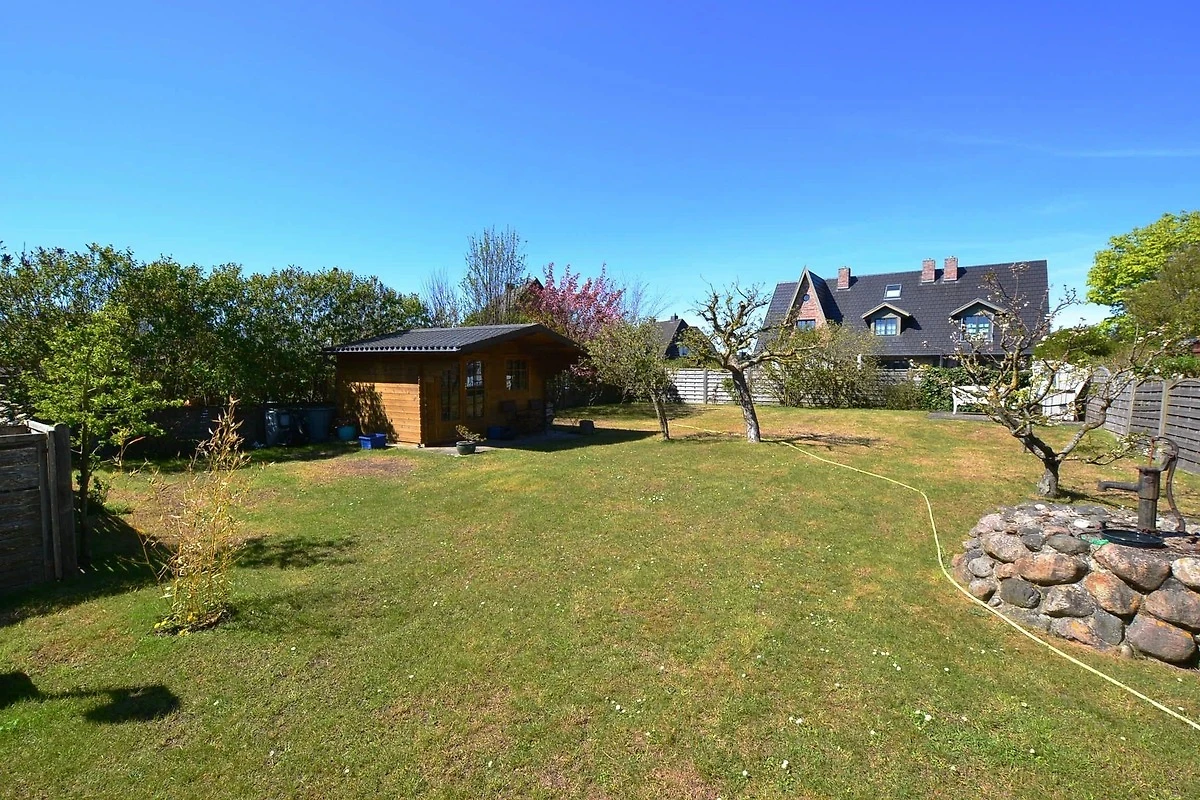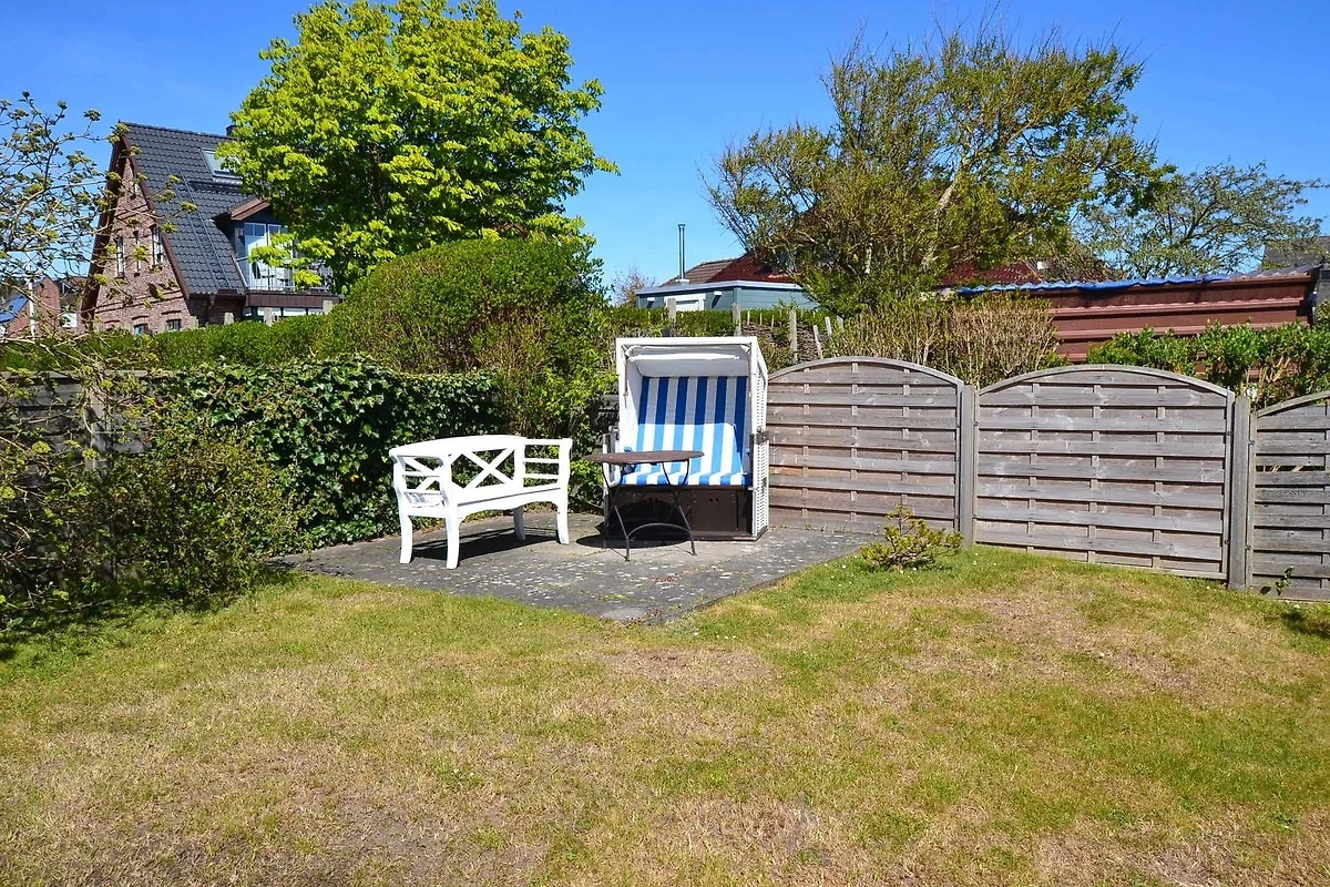 Im Aussenbereich lädt eine idyllische Liegewiese mit einem Strandkorb (nutzbar von April bis Oktober) zum Sonnenbaden und Entspannen ein – geniessen Sie die frische Seeluft und die Ruhe in Ihrem eigenen kleinen Rückzugsort im Grünen.
