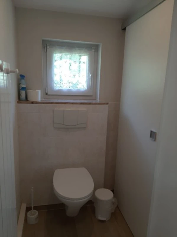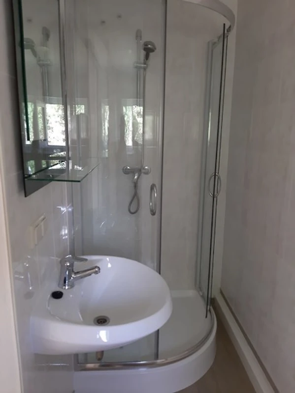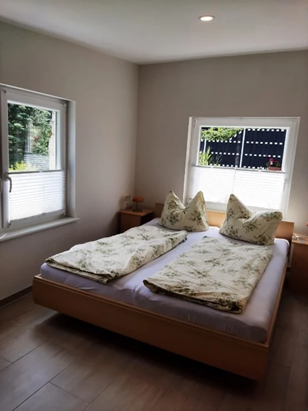 Sie betreten die kleine Ferienwohnung, im separaten Anbau, mit eigenem Eingang, gleich im Wohnbereich mit kleiner Küche. Hier finden Sie eine Miniküche mit zwei Kochplatten, einem Spülbecken und Kühlschrank, Küchenschränke, Kaffeemaschine, Toaster und Wasserkocher. Desweiteren stehen hier ein flacher Schrank, ein Tisch, zwei Sessel, eine Stereoanlage und ein Fernseher. Im Schlafzimmer stehen ein Doppelbett, ein Kleiderschrank und ein Rattansessel. Das Bad ist mit einer Dusche, Waschbecken und dem WC ausgestattet. Vor der Tür ist Ihre Terrasse mit Gartenmöbel, Hollywoodschaukel und Grill. Ein PKW-Parkplatz ist auf dem Grundstück vorhanden. Mitgebrachte Fahrräder können Sie in die grosse Garage stellen.