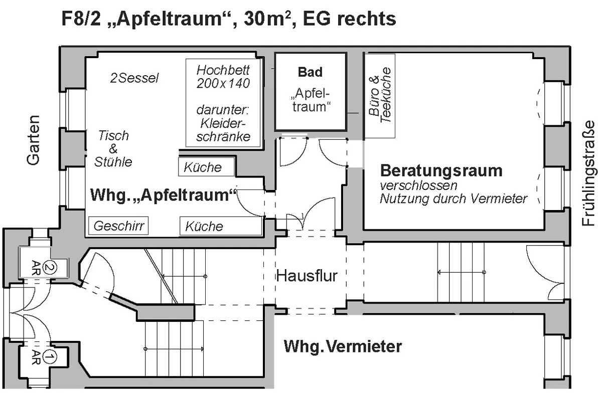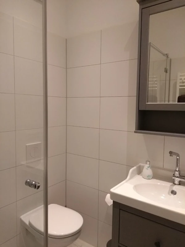 Das Zimmer ist über den Eingangsflur mit einem eigenständigen Bad mit bodengleicher Dusche verbunden. Ebenfalls vom Flur erreichbar ist ein separat genutzter, privater Beratungsraum.