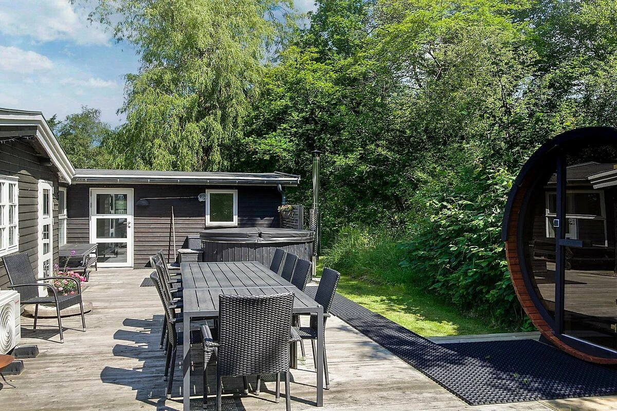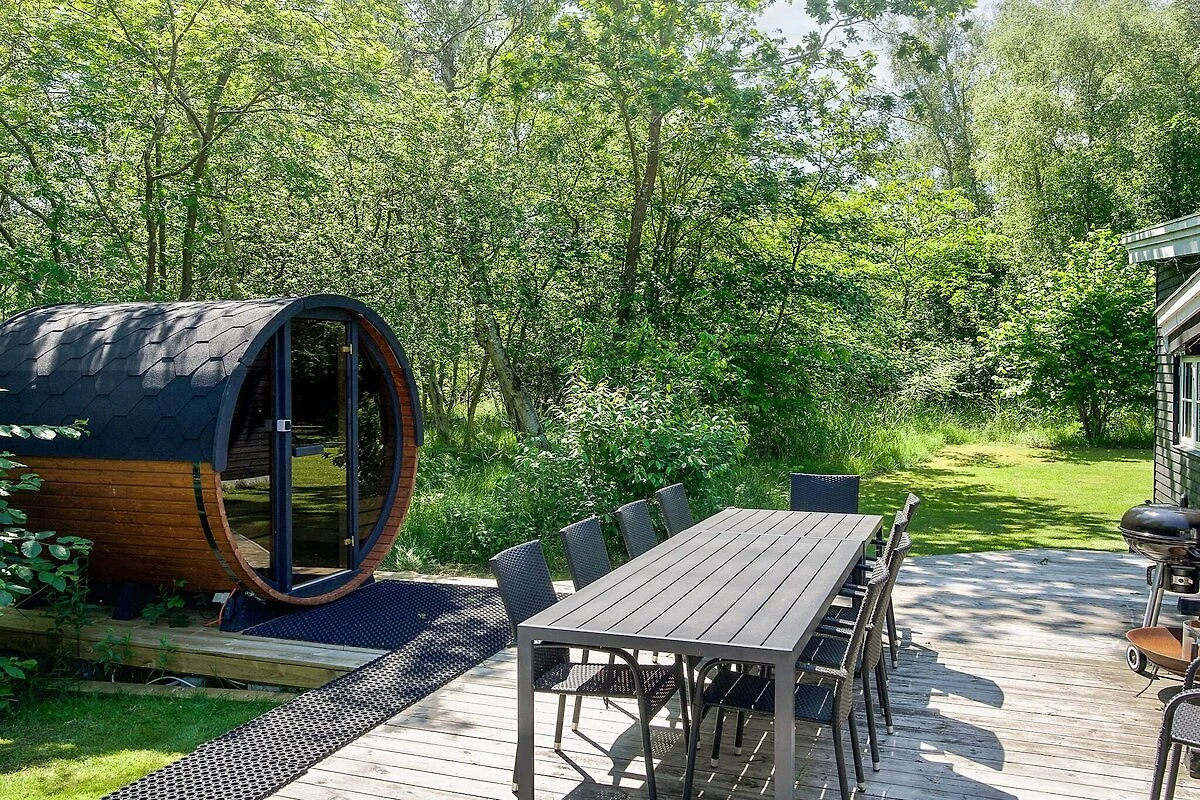 , Küche(Kochherd(elektrisch), Kaffeemaschine, Mikrowelle, Spülmaschine, Kühl-/Gefrierkombination), Wohn-/Schlafzimmer(TV(Deutsch Fernsehsender, dänische Fernsehsender), Hochstuhl), Schlafzimmer(Doppelbett, Babybett), Schlafzimmer(Doppelbett), Schlafzimmer(2x Einzelbett), Schlafzimmer(2x Etagenbett), Badezimmer(Fußbodenheizung)(Waschbecken, Dusche, Toilette, Waschmaschine), Badewanne(im Garten), Sauna(im Garten, erwärmt, 5 Personen), Heizung(elektrisch), Terrasse, Luft-Luft-Wärmepumpe
