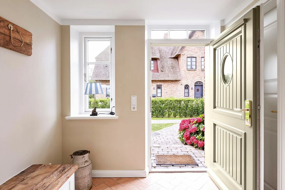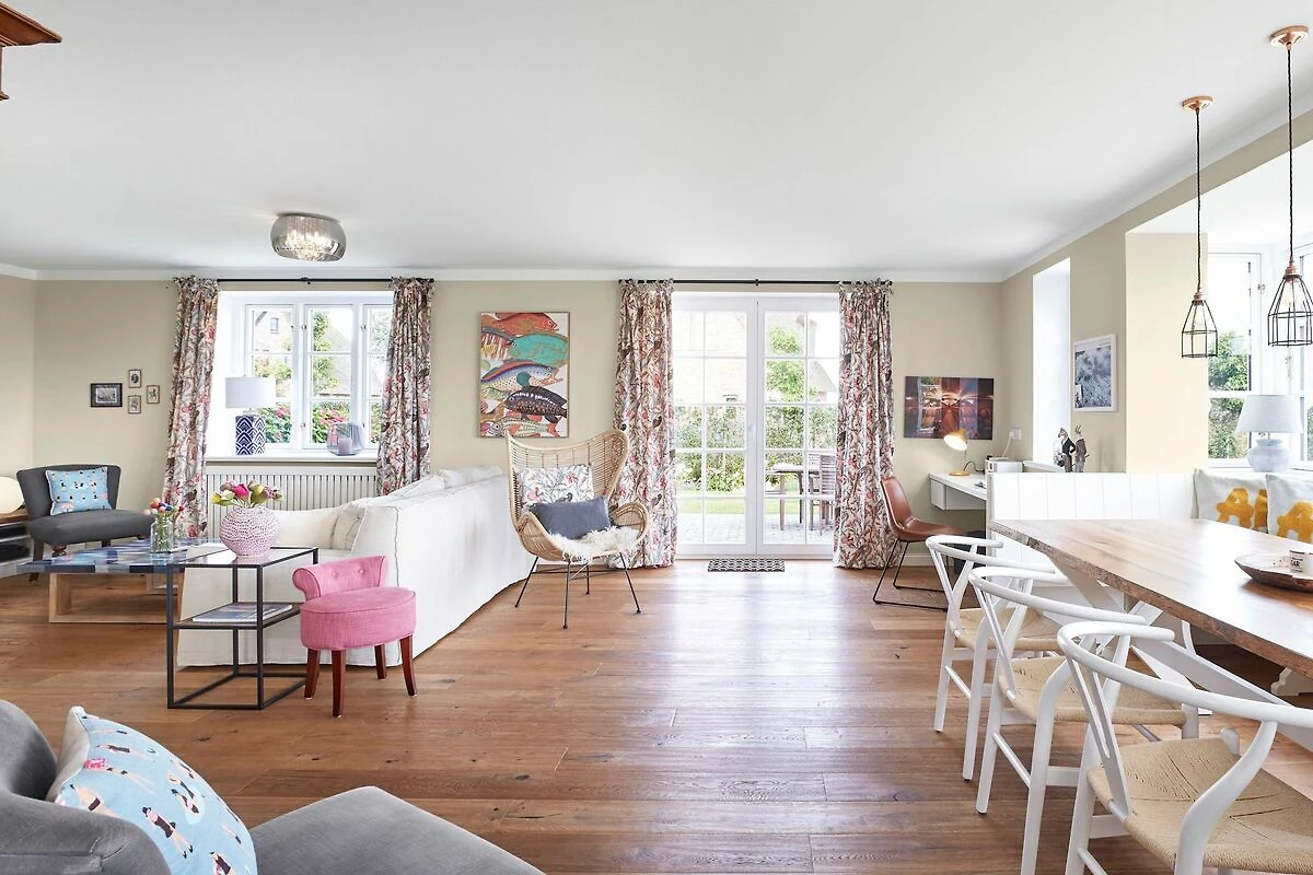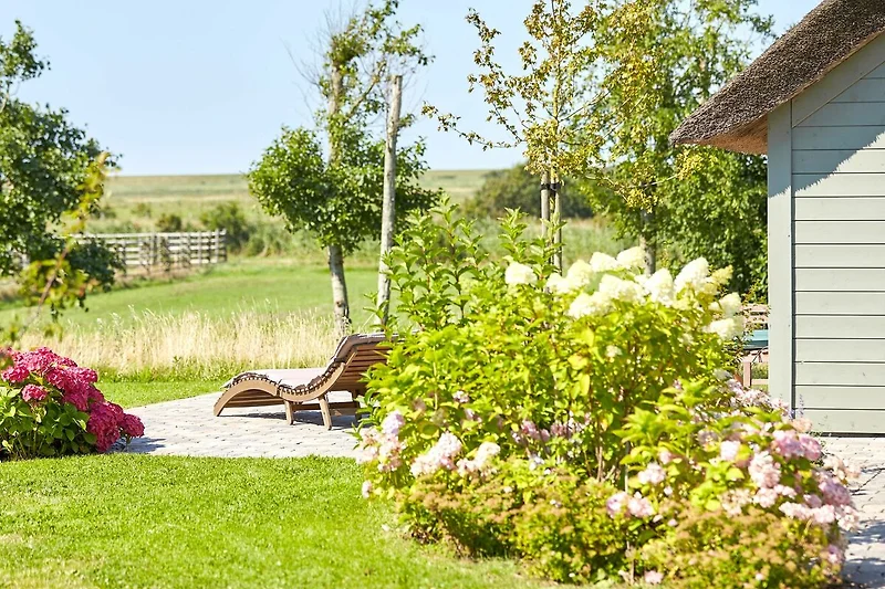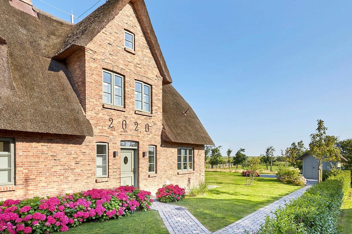 Dieses am „westlichen Deich“[nbsp] liegende Reetdachdoppelhaus befindet sich am Ortsrand des beschaulichen und wunderschön-typischen Inseldorfes Oldsum. Mit freiem Blick in die Föhrer Marsch geniessen Sie die Natur direkt schon am Morgen beim Aufstehen und von der Terrasse beim Frühstück mit der Familie. Der riesige naturnahe Garten lädt ein zum gemütlichen Lesen oder Träumen ein. Für die Kinder ist draussen wie drinnen ausreichend Platz um sich zu amüsieren und die Natur zu entdecken.