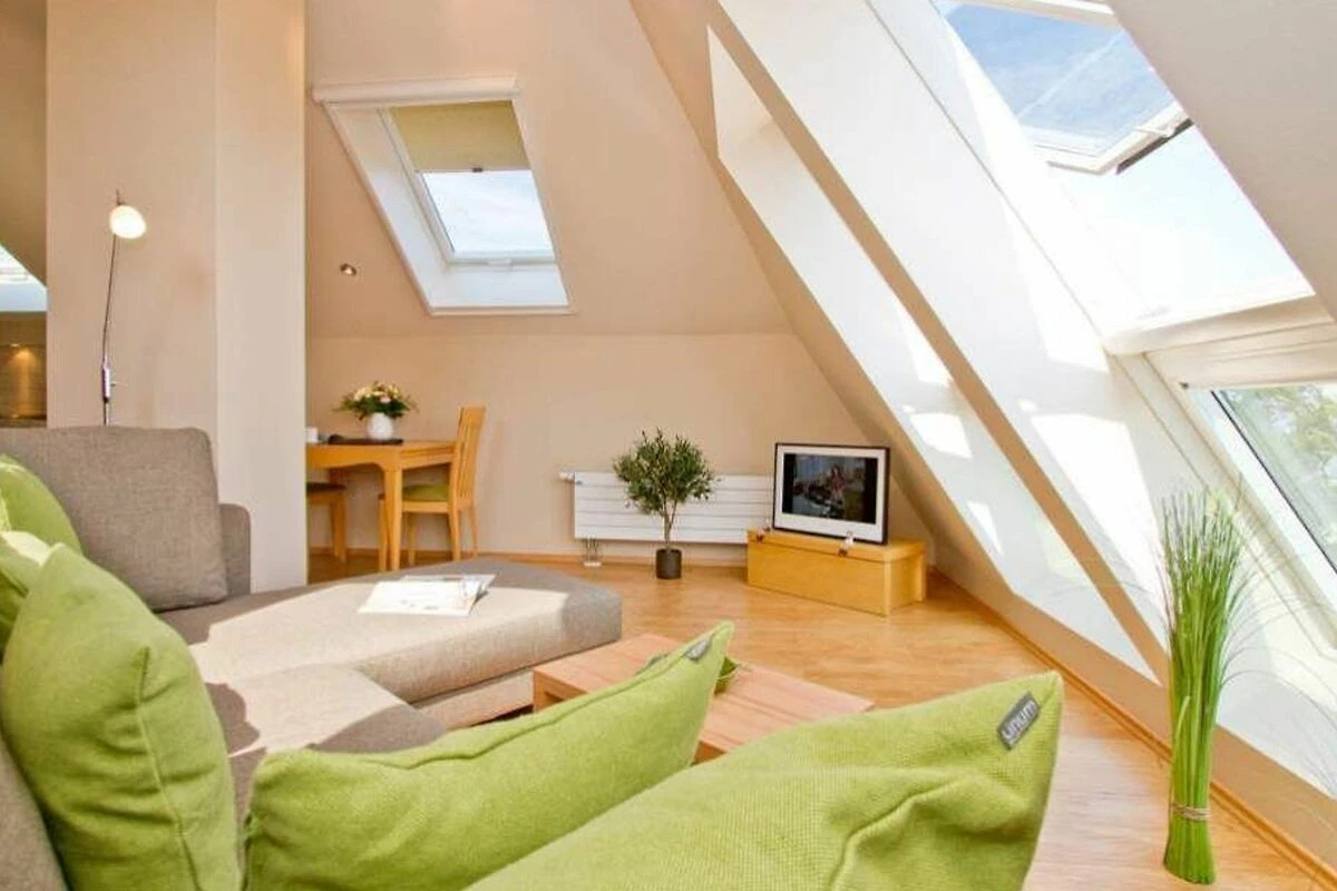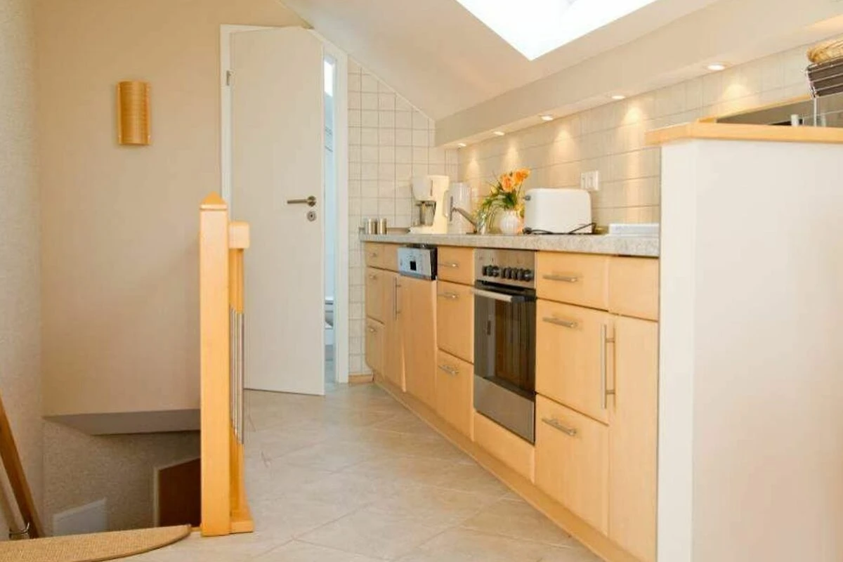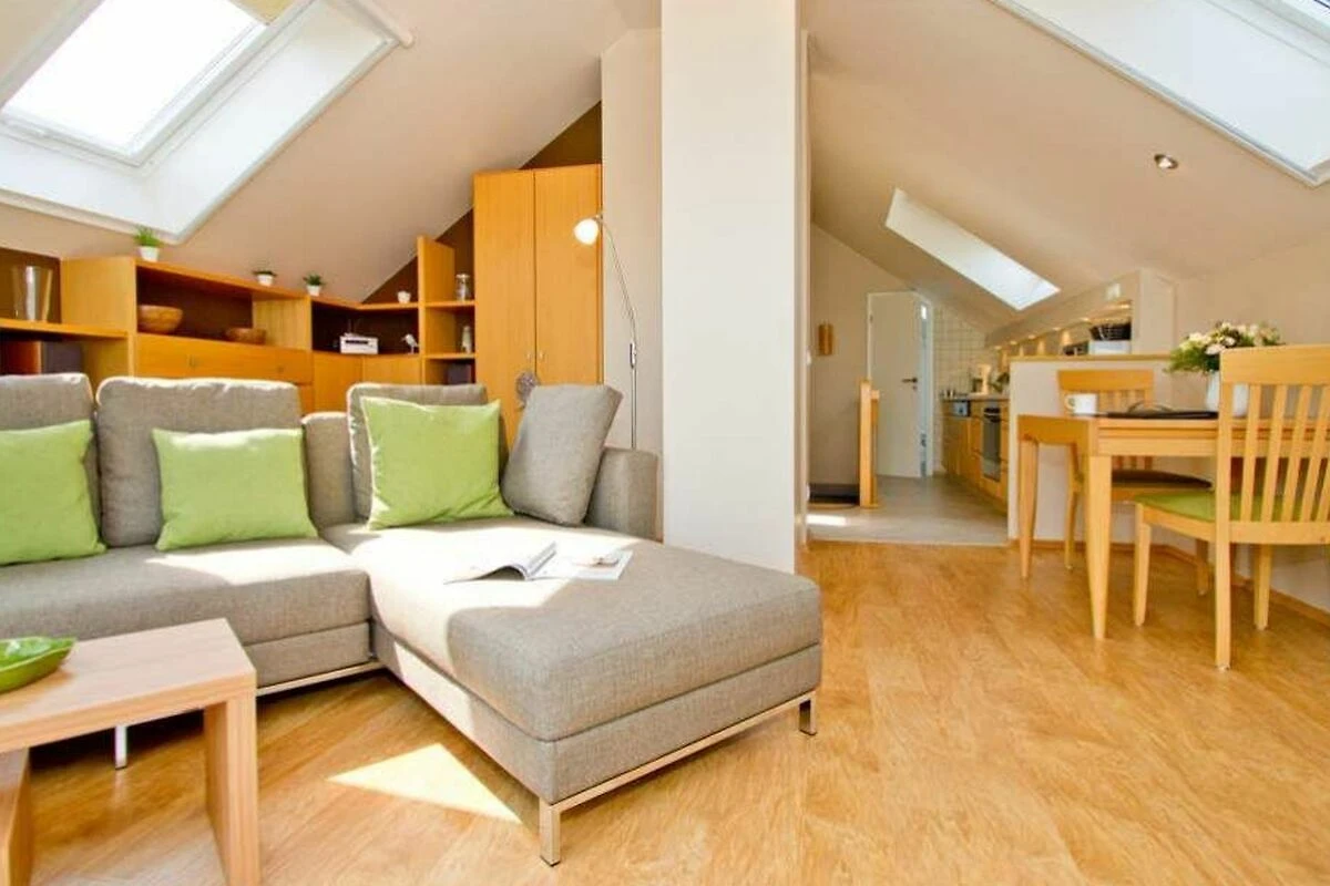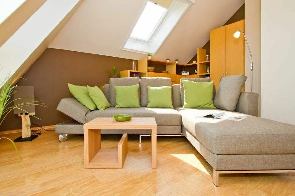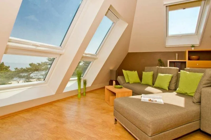 Im Dachgeschoss der Villa Strandperle empfängt Sie diese attraktive 2-Raum-Ferienwohnung. Das helle, freundliche Appartement ist 40 qm gross. Modern, komfortabel und geschmackvoll eingerichtet, bietet es 2 Personen und einem Kleinkind (bis 3 Jahre) Platz zum Wohlfühlen. Aus den Dachfenstern geniessen Sie den wunderschönen Blick auf die Ostsee. Das Domizil verfügt über ein Wohnzimmer, eine offene Küche, ein Schlafzimmer mit Doppelbett (nur von einer Seite begehbar) und ein Bad mit Dusche und WC. Auf Wunsch stellen wir für unsere kleinen Gäste ein Kinderreisebett (ohne zusätzliche Matratze [&] Bettzeug) und einen Kinderhochstuhl ( gegen einen Aufpreis) zur Verfügung. Für Ihren Komfort sind die Betten bei der Anreise bezogen und Handtücher liegen bereit (Erstausstattung). PKW-Stellplatz am Haus.