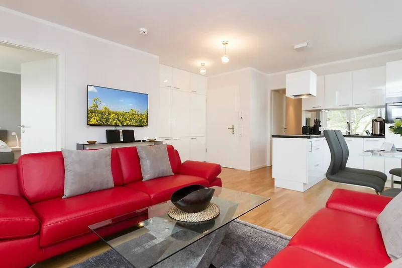 Klare Linie und kräftige Farben, ausgesuchte Materialien und ein modernes Design überzeugen im Appartement 18. Eintreten und Wohlfühlen ist hier die Devise, denn der Wohlfühlfaktor kommt hier nicht zu kurz! Die 3-Raum-Ferienwohnung (62 qm) für 4 Personen inklusive Kleinkind befindet sich im 2. Obergeschoss der Dünenresidenz. Schon beim Eintreten offeriert sich der helle Wohnbereich, ausgestattet mit zwei modernen Ledersofas und Flat-TV. Die angrenzende, offene Küche mit Essplatz fügt sich harmonisch ein und ist natürlich komplett ausgestattet. Zwei Schlafzimmer mit jeweils eigenem Bad bieten einen idealen Rückzugsort. Das erste Schlafzimmer verfügt über ein komfortables Doppelboxspringbett (1,80m x 2,00m), ein kleines Duschbad und Zugang zum Balkon. Das zweite Schlafzimmer wartet mit einem bequemen Doppelboxspringbett (1,60m x 2,00m) und Flat-TV auf, hier ist eine eigene Sauna im Duschbad integriert. Die Usedomer Sonne geniessen Sie schon beim Frühstück auf dem Ostbalkon, ausgestattet mit Gartenmöbeln. Hier kann man bei ein bisschen Meerblick wunderbar Relaxen. Für Ihren Komfort sind die Betten bei der Anreise bezogen und Handtücher liegen bereit. Ein Pkw-Stellplatz steht in der Tiefgarage zur Verfügung (max. Einfahrtshöhe 1,93 m). Das Wlan-Netz kann kostenlos genutzt werden.