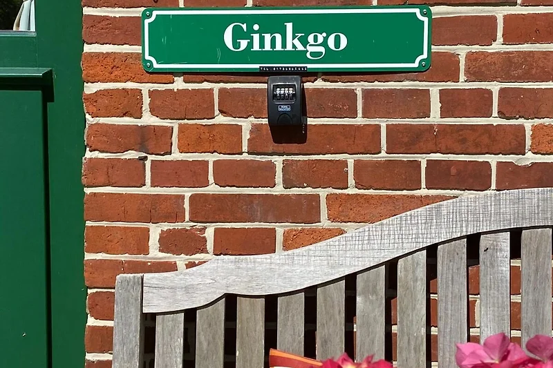 Eine Holzbank neben der Tür lädt mit Blick in den Garten zum Verweilen ein.