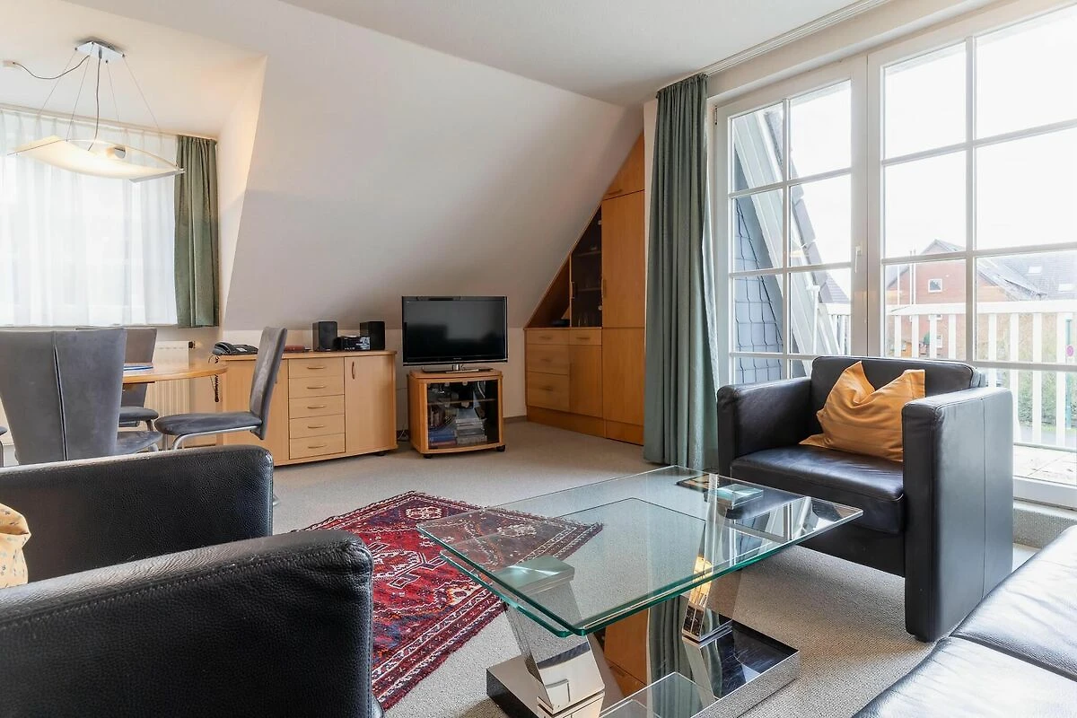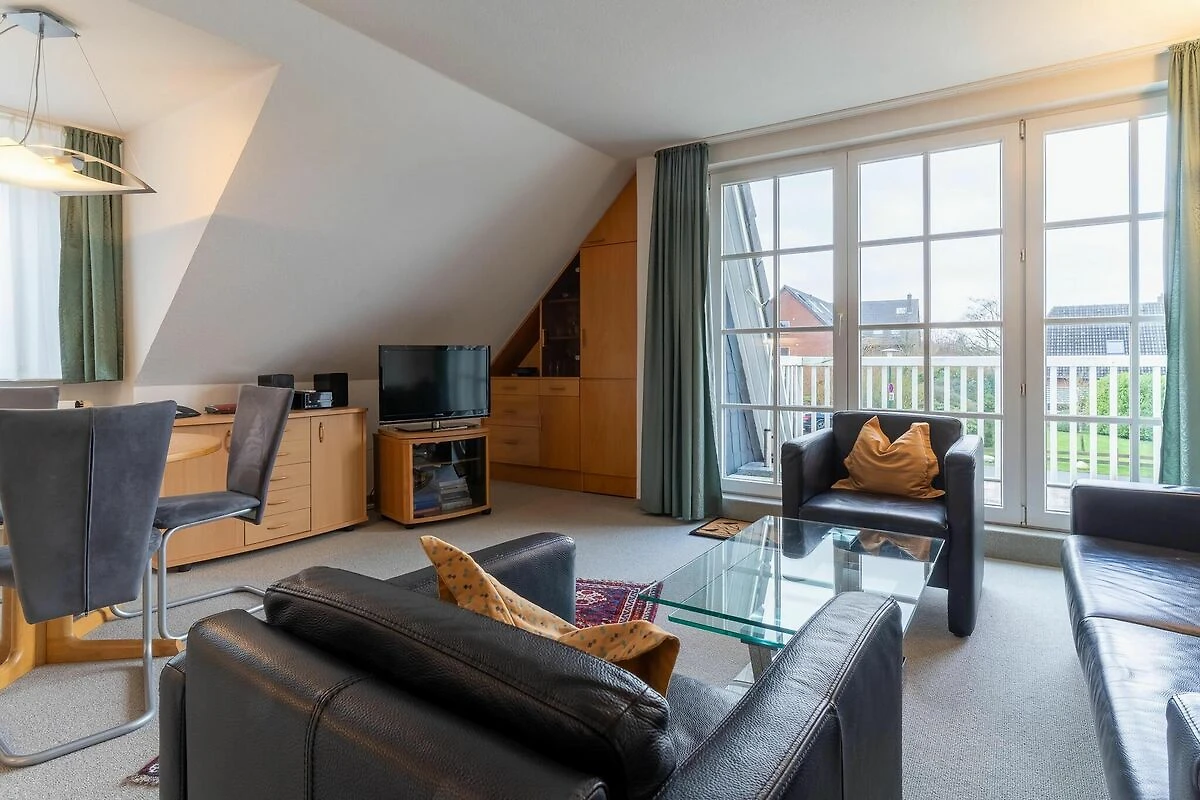 Im Wohnraum findet man Entspannung in der gemütlichen Sitzecke mit Flachbildschirm, Radio. Die in den Wohnraum integrierte komplett ausgestattete Einbauküche bietet eine angenehme Möglichkeit sich selbst zu versorgen. Das moderne Bad ist mit Dusche und WC ausgestattet. Zur Erholung an der frischen Seeluft lädt ein vom Wohnraum zu betretender Balkon mit Gartenmöbeln ein. Es stehen 2 Schlafzimmer zur Verfügung, das eine im Obergeschoss und das im Dachgeschoss mit Blick über den Ordinger Deich genießen. Die vorhandenen Fliegengitter sind mit Pollenschutz. Ferner gehören ein Abstellraum sowie ein Pkw-Stellplatz zu der Wohnung.