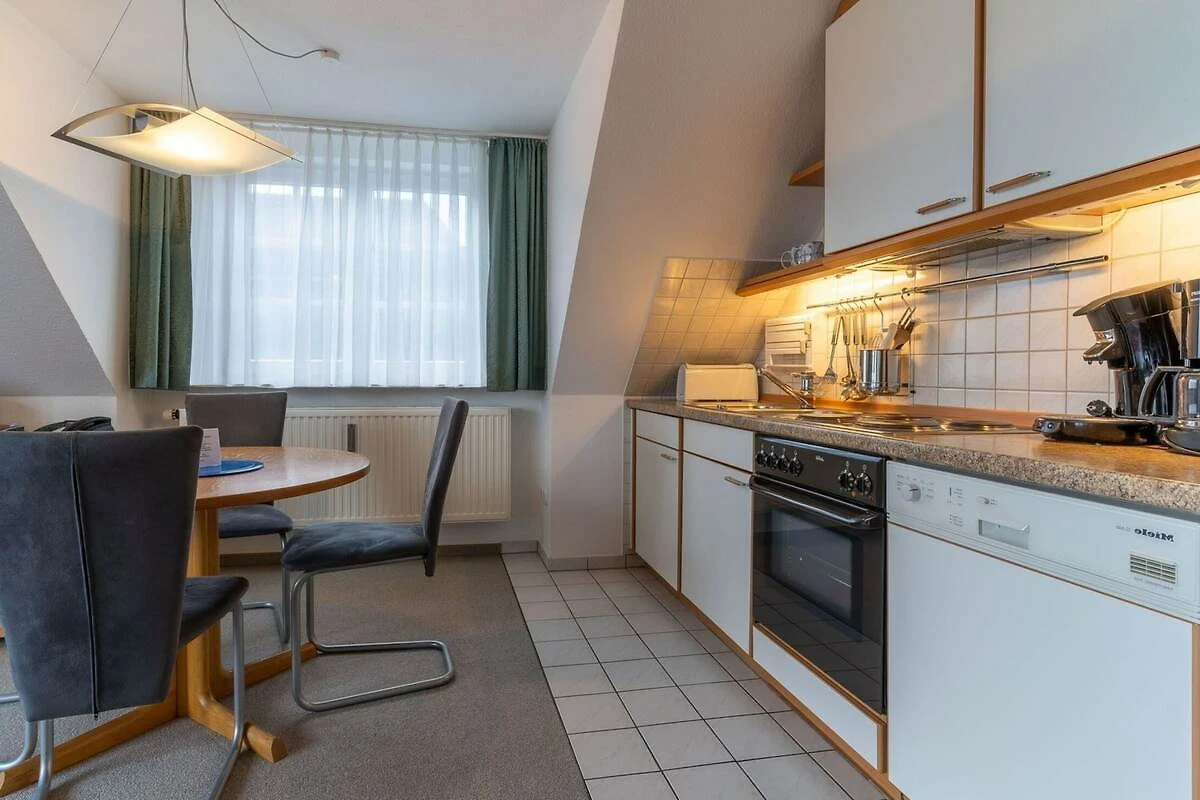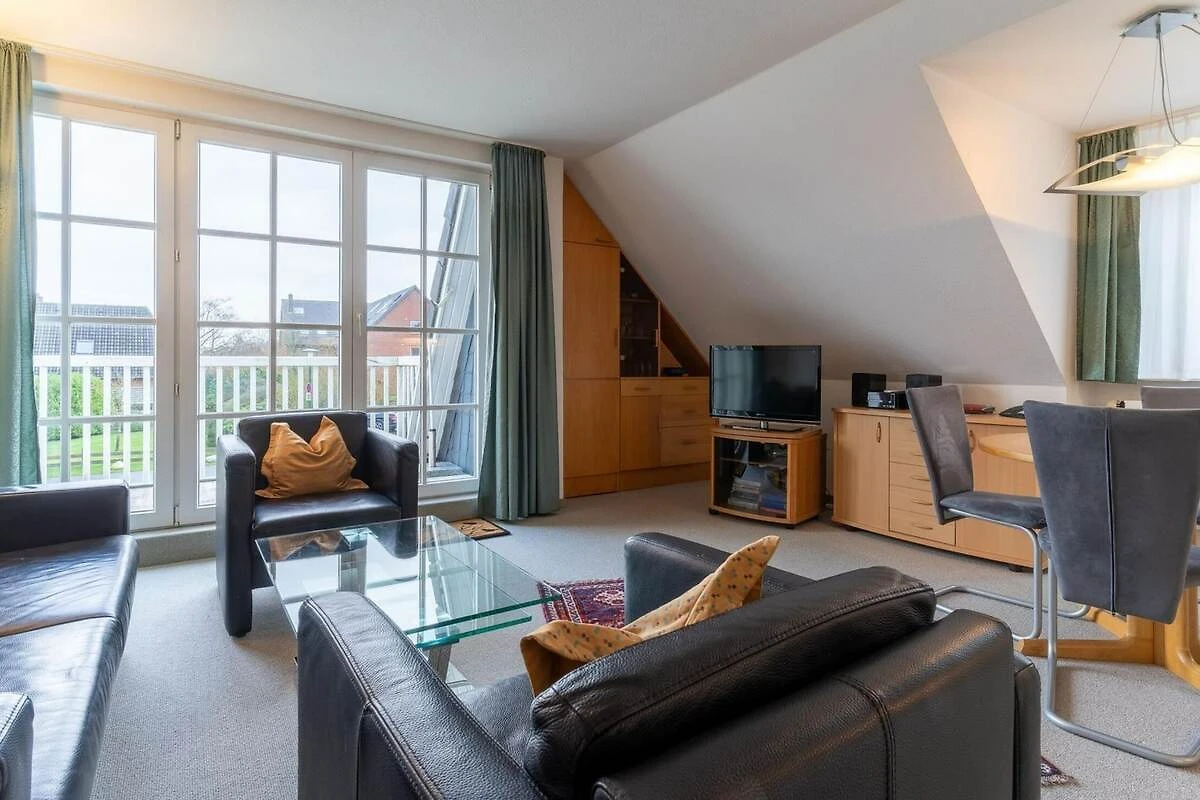 Im Wohnraum findet man Entspannung in der gemütlichen Sitzecke mit Flachbildschirm, Radio. Die in den Wohnraum integrierte komplett ausgestattete Einbauküche bietet eine angenehme Möglichkeit sich selbst zu versorgen. Das moderne Bad ist mit Dusche und WC ausgestattet. Zur Erholung an der frischen Seeluft lädt ein vom Wohnraum zu betretender Balkon mit Gartenmöbeln ein. Es stehen 2 Schlafzimmer zur Verfügung, das eine im Obergeschoss und das im Dachgeschoss mit Blick über den Ordinger Deich genießen. Die vorhandenen Fliegengitter sind mit Pollenschutz. Ferner gehören ein Abstellraum sowie ein Pkw-Stellplatz zu der Wohnung.