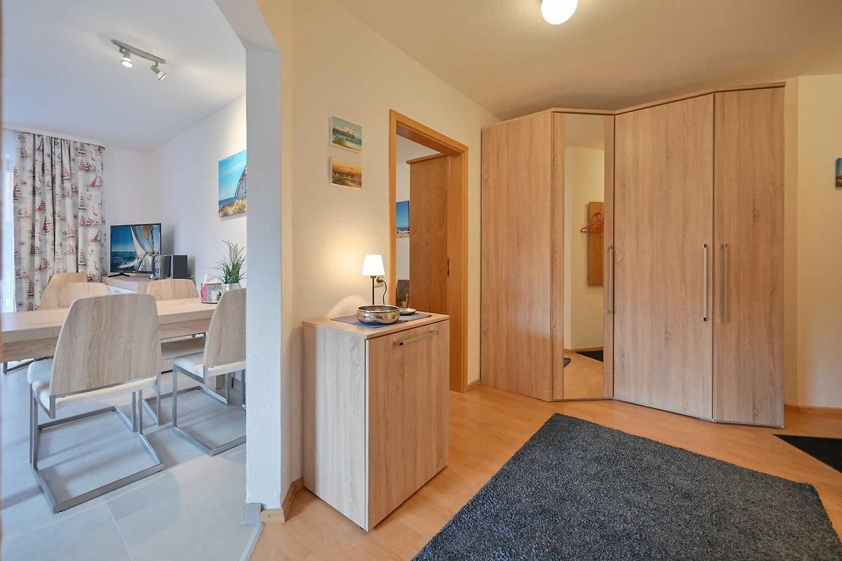 Im Flur steht eine Garderobe, Kommode, Schuhregal und ein grosser Einbauschrank mit integriertem Spiegel.