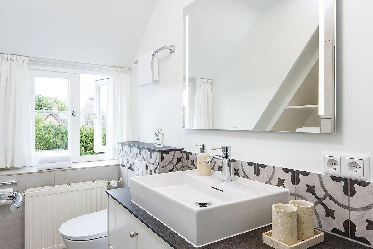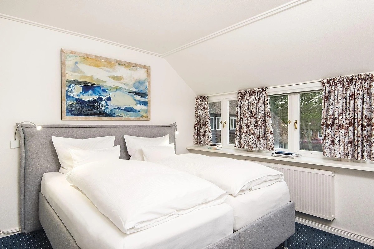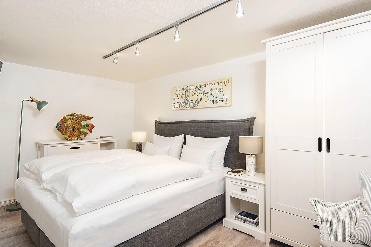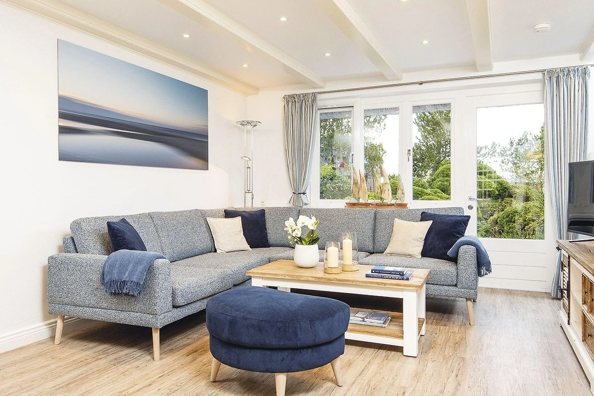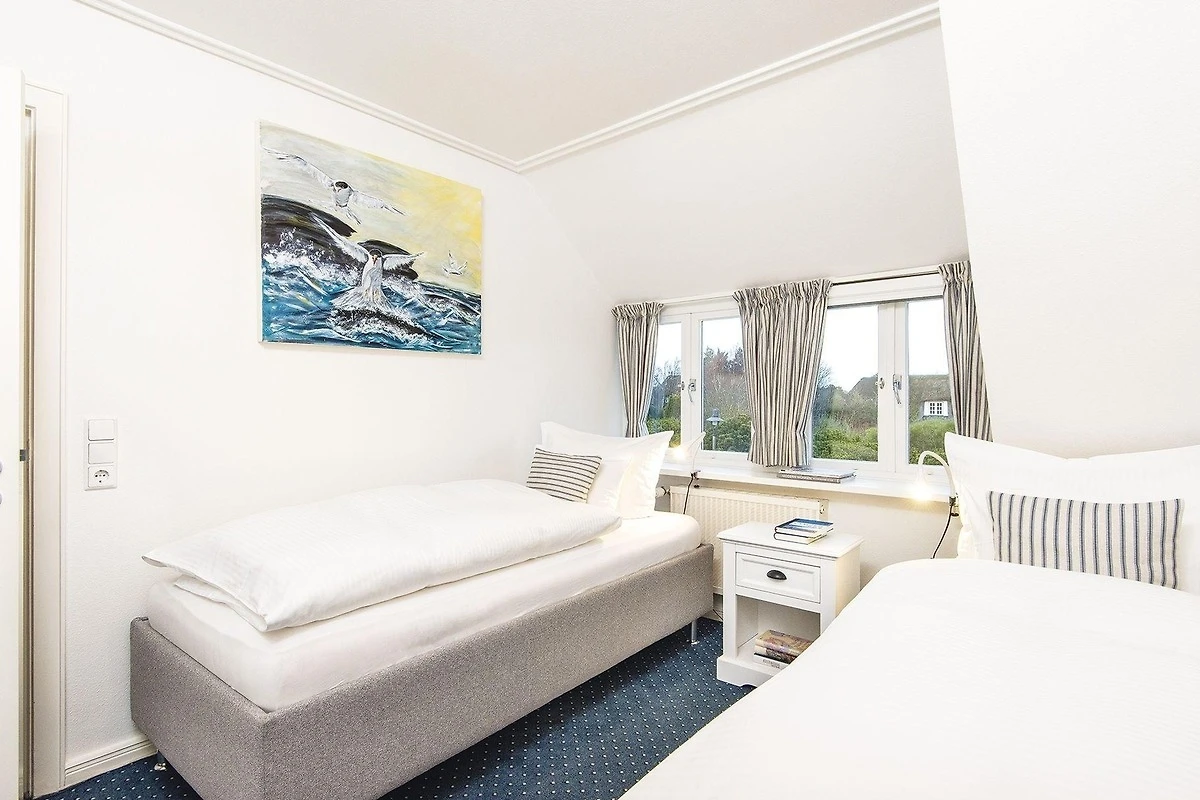 Dieses neu eingerichtete Hausteil bietet viel Platz in ruhiger Lage im Süden Kampens und doch sind es nur wenige Gehminuten bis zur Whiskeymeile. Ein kleiner Flur empfängt Sie und mündet in den modernen Wohnbereich mit offener Küche. Dieser ist wohnlich maritim eingerichtet und mit Holzfussboden ausgestattet. Der Blick führt hinaus auf die Südterrasse und in den grossen Gemeinschaftsgarten mit den schönen Sylter Heckenrosen. Oben befinden sich ein Duschbad, ein helles Doppelschlafzimmer mit TV und ein Zweibettzimmer, jeweils mit Teppichboden ausgelegt. Im grosszügigen Untergeschoss finden Sie gemütliches Doppelschlafzimmer mit TV und Holzfussboden, sowie ein grosszügiges Duschbad. Ein idyllischer Rückzugsort für Ruhesuchende und Familien mit zwei ganz frisch renovierten Bädern.