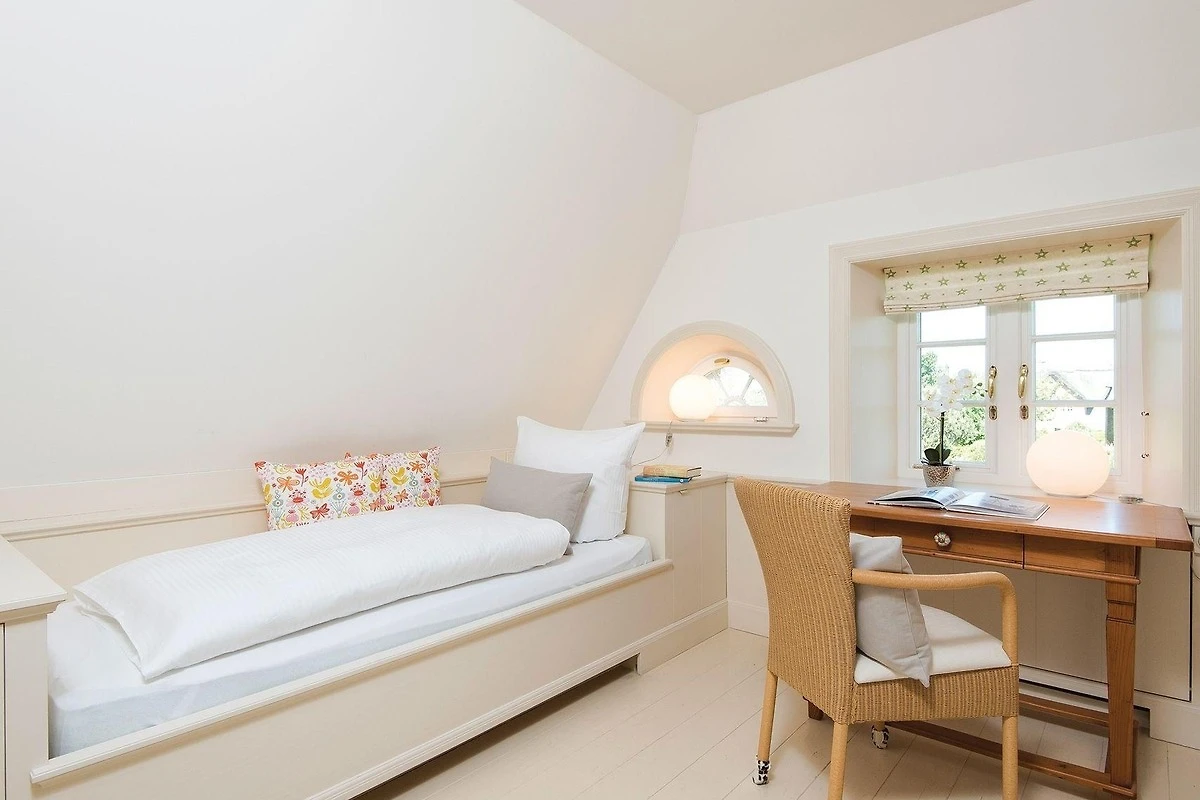 Das Biike Hüs befindet sich im Herzen des alten Kampener Ortskerns. Unweit der Hauptstrasse und doch ruhig in einem wunderschön eingewachsenen Garten liegt dieses Endhausteil. Das Erdgeschoss präsentiert sich mit Wohnbereich und separater Küche im Landhausstil, sowie einer freundlichen Essecke. Der Kamin, die bequemen Wohlfühlsofas, ein Smart-TV und Rundumblick in den Garten mit Süd- Westterrasse laden auch bei "Nordseewetter" zum Verweilen ein. Im Obergeschoss finden Sie ein Doppelschlafzimmer mit Südblick. Nebenan ein Einzelzimmer mit Kojenbett und Smart-TV, beide teilen sich ein grosszügiges Duschbad. Das Besondere: im Flur finden Sie einen geräumigen begehbaren Kleiderschrank. Im Untergeschoss befindet sich ein weiteres Schlafzimmer mit zwei Einzelbetten. Dieses ist mit Teppichboden ausgelegt und verfügt ebenfalls über einen Smart- TV. Angrenzend ist ein Duschbad. Ein privater Wellnessbereich mit grosszügiger Sauna, Badewanne, Dusche und einem grossen Fenster runden das stimmige Bild dieses Hausteils ab.