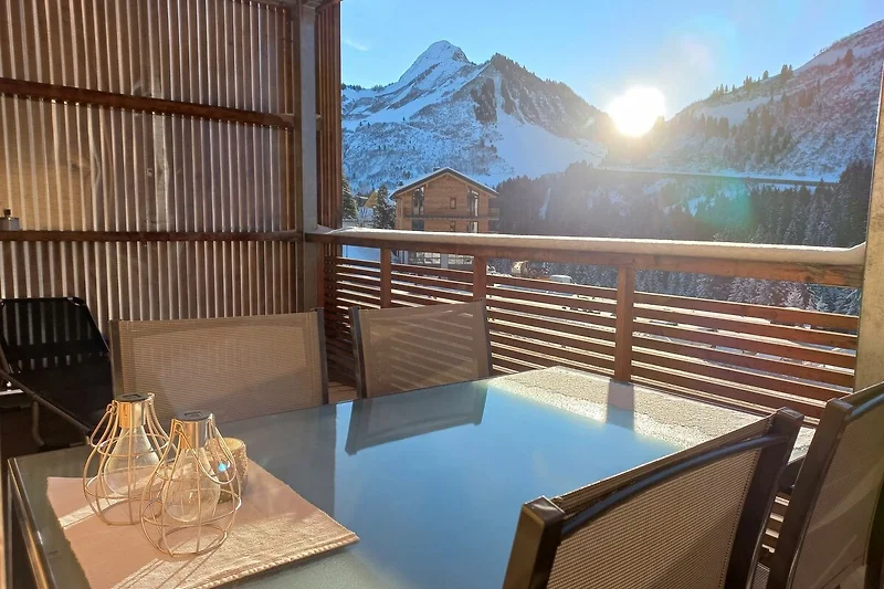 Die überdachte und windgeschützte Terrasse ist mit Stühlen, Tisch und zwei Liegebetten ausgestattet. Waschmaschine und Trockner stehen im Skiraum zur Verfügung. ( 1,-- Münzeinwurf).