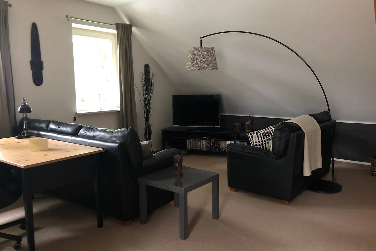 Attika Schlafzimmer mit 1.80m Doppelbett, Schreibtisch mit Bürostuhl, helles Badezimmer mit Dusche und Waschmaschine, geräumiges Wohnzimmer mit Ledercouch, LCD Fernseher mit DVD Spieler und Zattoo Box mit deutsch- und englischsprachigen Fernsehkanälen, Küche mit kleinem Esstisch, Wasserkocher, Toaster, Nespresso Kaffeemaschine, Bügeleisen und Bügelbrett, Wäscheständer, WLAN im gesamten Wohnungsbereich, Parkmöglichkeiten auf dem Grundstück oder an der Strasse, Grundstück ist durch elektrisches Tor gesichert, ruhige Lage am Ende einer Sackgasse, Hinweis für Allergiker: Es befinden sich Hunde und Katzen im Haus, gesprochene Sprachen: Deutsch/Englisch