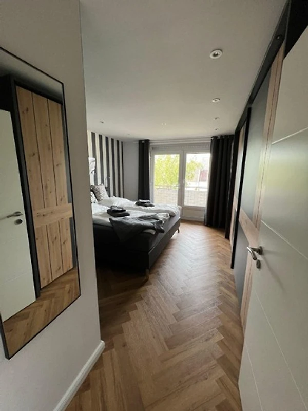 Das grosszügige Schlafzimmer wurde versehen mit einem Kingsize-Boxspringbett (200x200cm) und einem Kleiderschrank mit Schiebetüren und viel Platz für Ihr Gepäck. Alles ebenfalls neu renoviert und eingerichtet.