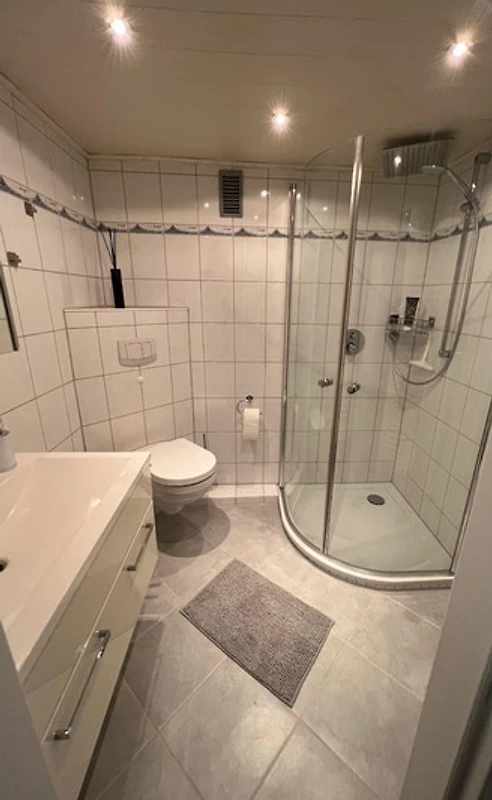 Ein modernes, helles Duschbad, welches sich direkt am Schlafzimmer befindet, rundet den Flair der Suite ab.
