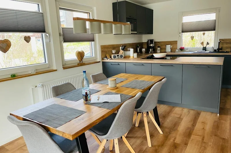In der offenen Küche mit grossem Esstisch steht Ihnen eine hochwertige Küche mit Induktionsfeld, Backofen, Geschirrspüler, Kühlgefrierkomination, Toaster, Kaffeemaschine usw. zur Verfügung. Ausgestattet ist die Küche zudem mit diversen Gewürzen, Filtertüten, Spül-Tabs, Geschirrhandtücher etc.
