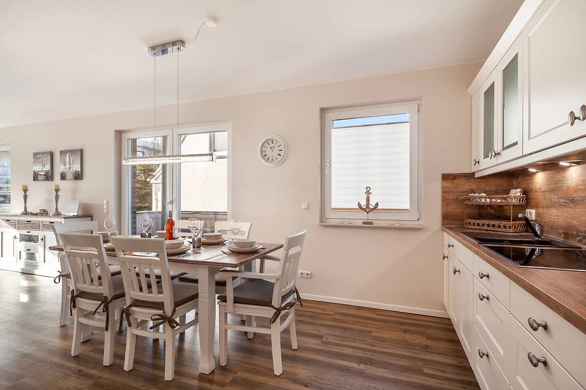 Die hochwertige Einbauküche im ansprechenden Design ist mit Markengeräten ausgestattet. Sie verfügt über Geschirrspüler, Cerankochfeld, Dunstabzugshaube, Backofen im Hochschrank und Kühl- /Gefrierkombination.