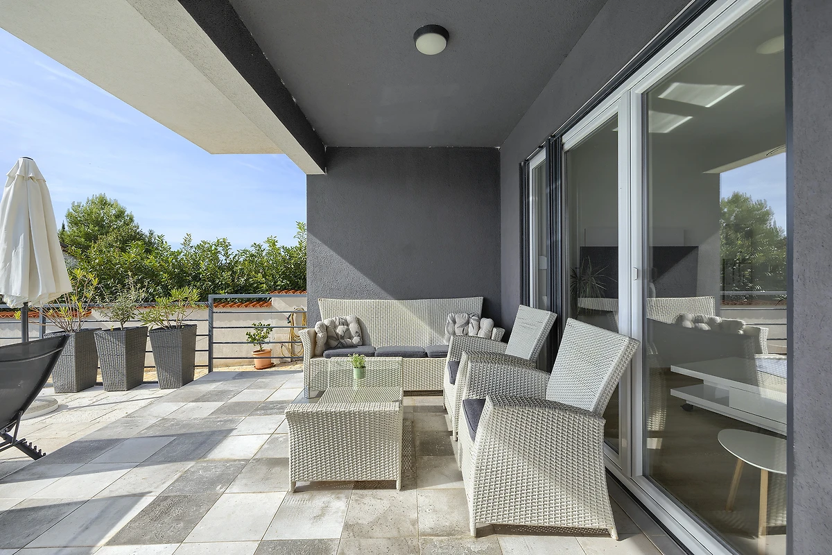 Eine schöne überdachte Außenterrasse mit Grill, ein Balkon mit perfektem Panoramablick auf das Meer und den Pool laden zu einem perfekten und erholsamen Urlaub ein.
