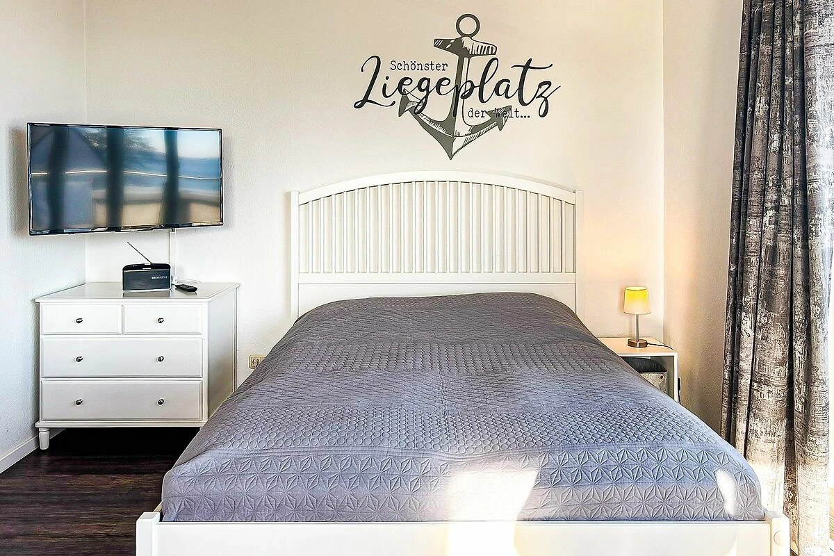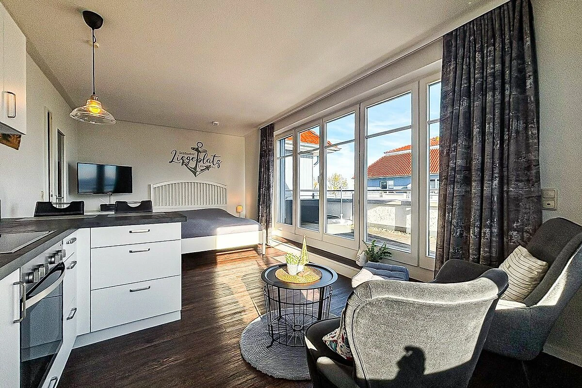 Vom Wohnraum aus gelangen Sie auf die möblierte Dachterrasse mit einem eigenen Strandkorb, einer Liege, einer Sitzgruppe mit Tisch sowie Seeblick. Der praktische Wohn- und Schlafbereich ist mit einem Bett (2x 80er x 200 cm) ausgestattet. Für Unterhaltung sorgen ein Flachbild-TV und ein Radio.